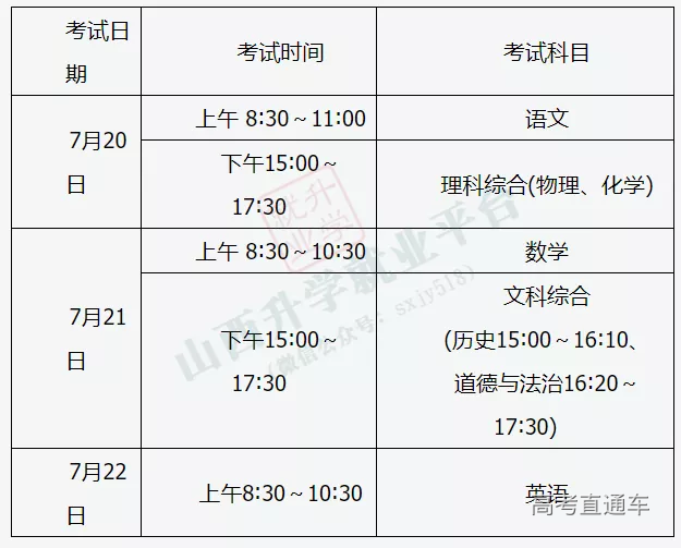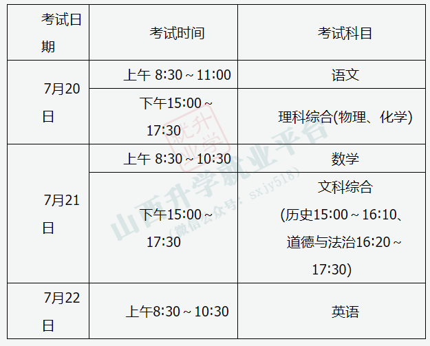 考试时间为7月20日、21日、22日,具体时间见下表: