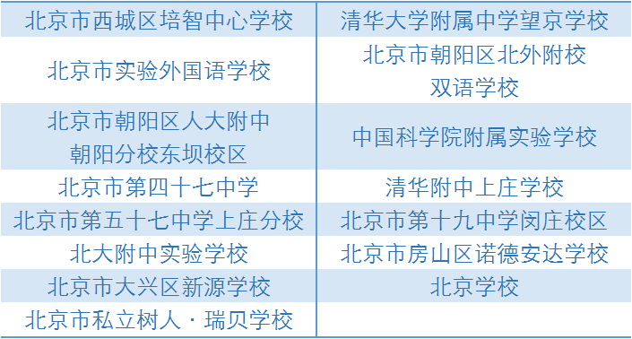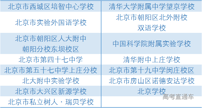 新增普通高中学校 停招&更名 北京师范大学实验华夏女子中学、北京中医学院附属中学、北京世青国际学校、北京市私立新亚中学、北京市昌平区第三中学、北京市昌平区沙河中学、北京中科青云实验学校7所普通高中2020年停止招生。 今年全市有4所普通高中更名,分别为北京石油学院附属中学更名北京一零一中石油分校、中国矿业大学(北京)附属中学更名为北京一零一中矿大分校,北京市团结湖第三中学更名为北京市陈经纶中学团结湖分校以及北京师范大学附属中学京西分校更名为人大附中石景山学校。 职技类学校 在职技类学校中,中专校招生数量与去年持平,技工学校减少北京二七机车厂技工学校1所,职高校减少北京市第一七九中学、北京现代职业教育学校、北京市朝阳区职业技术学校3所,新增北京市西城区培智中心学校1所。今年有招生资格学校名单中还减少了北京政法职业学院1所五年制高职。 北京教育考试院 中招办有关负责人: 要确保招生录取工作依法“公开、公平、公正”进行,坚决杜绝违规招生行为,未经公示的高级中等学校,不得擅自开展招生活动。有招生资格的学校只是意味着学校具备招生资格,但并不一定在今年安排有招生计划。今年具体有哪些学校招生,考生可参见《北京市高级中等学校招生简章(2020年)》。 2020年具有招生资格的 普通高中学校名单 1. 北京市第二中学 2. 北京市第五中学 3. 北京市第十一中学 4. 北京市第五十中学 5. 北京市第五十五中学 6. 北京市第一零九中学 7. 北京市第一六六中学 8. 北京市第一七一中学 9. 北京市广渠门中学 10. 北京汇文中学 11. 北京市东直门中学 12. 北京景山学校 13. 北京市第一中学 14. 北京市第二十一中学 15. 北京市第二十二中学 16. 北京市第二十四中学 17. 北京市第二十五中学 18. 北京市第二十七中学 19. 北京市第五十中学分校 20. 北京市第五十四中学 21. 北京市第六十五中学 22. 北京市第九十六中学 23. 北京汇文实验中学(北京市第一二五中学) 24. 北京市第一四二中学 25. 北京宏志中学 26. 北京市第一六五中学 27. 中央工艺美术学院附属中学 28. 北京市龙潭中学 29. 北京市崇文门中学 30. 北京市翔宇中学 31. 北京市阳光情学校 1. 北京市第四中学 2. 北京市第八中学 3. 北京市第十三中学 4. 北京市第十四中学 5. 北京市第十五中学 6. 北京市第三十五中学 7. 北京市第六十六中学 8. 北京市第一六一中学 9. 北京市铁路第二中学 10. 北京市育才学校 11. 北京市回民学校 12. 北京市西城外国语学校 13. 北京师范大学附属中学 14. 北京师范大学第二附属中学 15. 北京师范大学附属实验中学 16. 北京市第三中学 17. 北京市第七中学 18. 北京市第三十一中学 19. 北京市第三十九中学 20. 北京市第四十三中学 21. 北京市第四十四中学 22. 北京市第五十六中学 23. 北京市第一五六中学 24. 北京市第一五九中学 25. 外交学院月坛中学 26. 北京市徐悲鸿中学 27. 北京市鲁迅中学 28. 北京教育学院附属中学 29. 北京市宣武外国语实验学校 30. 北京师范大学亚太实验学校 31. 北京启喑实验学校 32. 北京市西城区培智中心学校 1. 北京市第八十中学 2. 北京市陈经纶中学 3. 北京市日坛中学 4. 北京市和平街第一中学 5. 对外经济贸易大学附属中学(北京市第九十四中学) 6. 北京市第十七中学 7. 北京工业大学附属中学 8. 中国人民大学附属中学朝阳学校 9. 北京汇文中学朝阳垂杨柳分校 10. 中国科学院附属实验学校 11. 北京市东方德才学校 12. 北京市三里屯一中 13. 东北师范大学附属中学朝阳学校 14. 清华大学附属中学朝阳学校 15. 清华大学附属中学望京学校 16. 北京化工大学附属中学 17. 中国科学院附属实验学校分校 18. 中央美术学院附属实验学校 19. 北京第二外国语学院附属中学 20. 北京市陈经纶中学团结湖分校 21. 黄冈中学北京朝阳学校 22. 华中师范大学第一附属中学朝阳学校 23. 北京市朝阳区人大附中朝阳分校 24. 北京市实验外国语学校 25. 北京市朝阳外国语学校 26. 北京拔萃双语学校 27. 北京市朝阳区爱迪外国语学校 28. 北京爱迪学校 29. 北京市力迈中美学校 30. 北京八十学校 31. 北京市朝阳区清华附中国际学校 32. 北京乐成国际学校 33. 北京市朝阳区北外附校双语学校 34. 北京市朝阳区人大附中朝阳分校东坝校区 35. 北京中学 1. 中国人民大学附属中学 2. 中国人民大学附属中学翠微学校 3. 中国人民大学附属中学第二分校 4. 人大附中西山学校 5. 北京航空航天大学实验学校 6. 北京市第一〇一中学 7. 北京市十一学校 8. 北京交通大学附属中学 9. 北京交通大学附属中学东校区 10. 北京市八一学校 11. 北京市八一学校附属玉泉中学 12. 北京市中关村中学 13. 北京市中关村中学知春分校 14. 北京市第二十中学 15. 首都师范大学附属中学 16. 首都师范大学第二附属中学 17. 首都师范大学附属育新学校 18. 清华大学附属中学 19. 清华大学附属中学永丰学校 20. 北京理工大学附属中学 21. 北京大学附属中学 22. 北京医学院附属中学 23. 北京市育英学校 24. 北京市第十九中学 25. 北京市海淀区教师进修学校附属实验学校 26. 北京市第五十七中学 27. 北京市育英中学 28. 北京实验学校(海淀) 29. 中国农业大学附属中学 30. 北京科技大学附属中学 31. 北京一零一中石油分校(原北京石油学院附属中学) 32. 北京师范大学第三附属中学 33. 