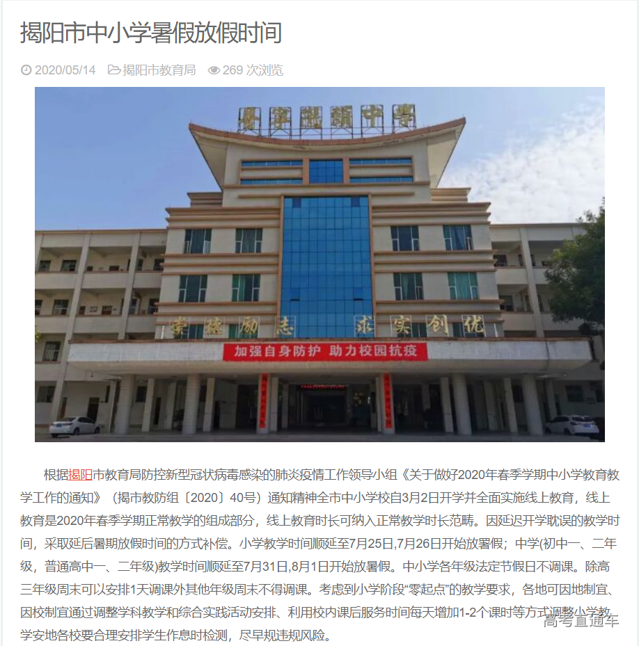 根据揭阳市教育局防控新型冠状病毒感染的肺炎疫情工作领导小组《关于做好2020年春季学期中小学教育教学工作的通知》(揭市教防组〔2020〕40号)通知精神全市中小学校自3月2日开学并全面实施线上教育,线上教育是2020年春季学期正常教学的组成部分,线上教育时长可纳入正常教学时长范畴。因延迟开学耽误的教学时间,采取延后暑期放假时间的方式补偿。