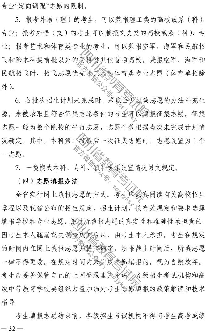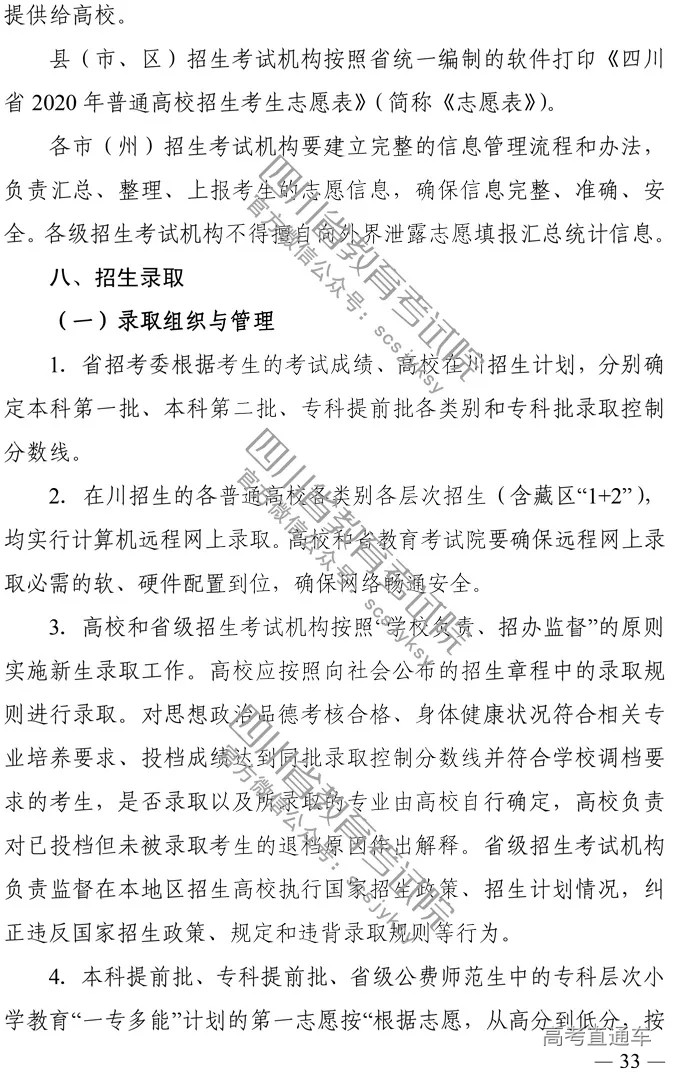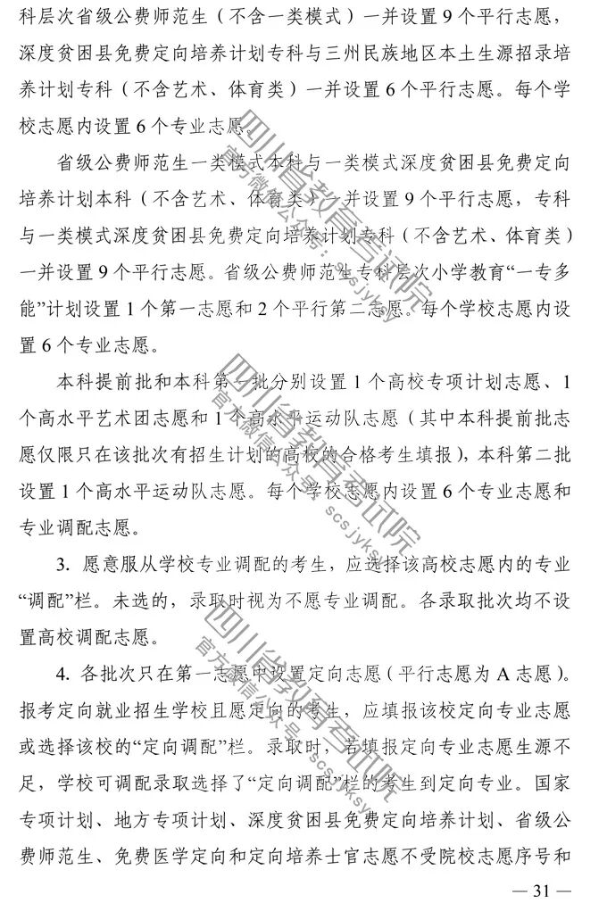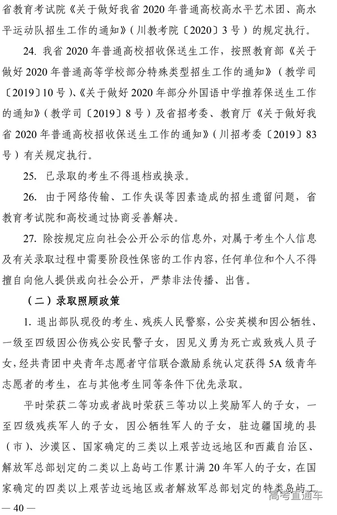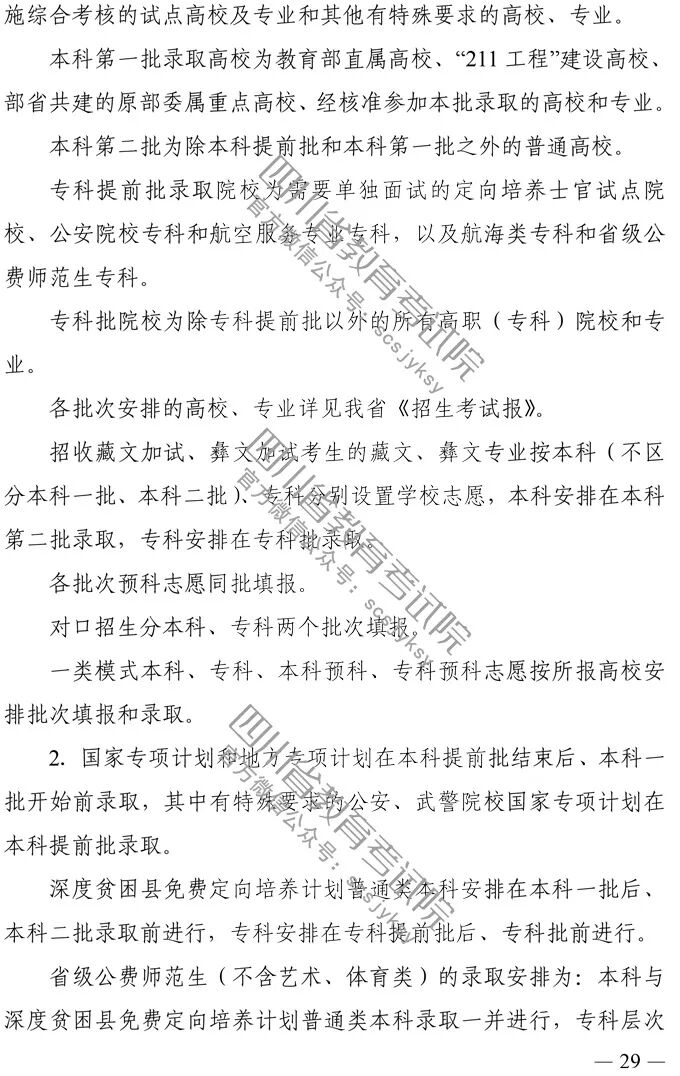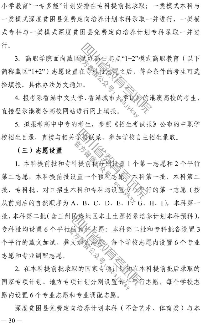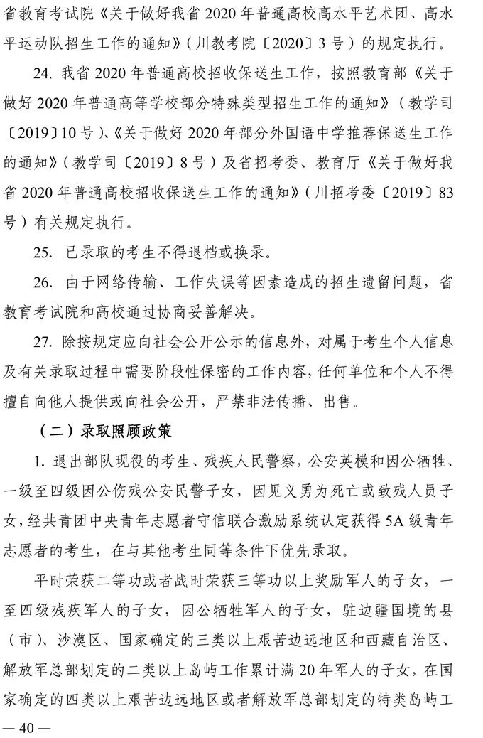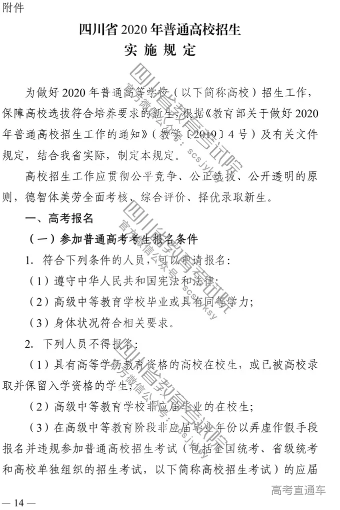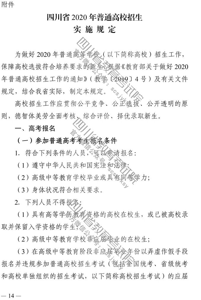 《四川省高等教育招生考试委员会 四川省教育厅关于做好我省2020年普通高校招生工作的通知》已下发,对我省2020年高考招生录取工作进行统一安排部署。小编将《通知》中的附件《四川省2020年普通高校招生实施规定》转发给大家,其中包括今年我省高考各批次的志愿填报时间、录取批次安排、志愿设置及志愿填报办法等,请考生务必仔细阅读。
