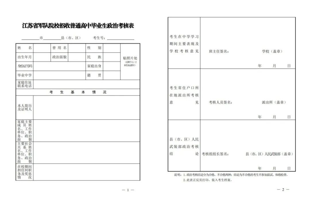 1、政治审查:考生可从省教育考试院下载或到人武部领取《江苏省军队院校招收普通高中毕业生政治考核表》,填报个人信息并报送人武部。