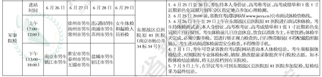 4、体格检查和面试:省军区会按设区市分批次组织考生进站体检和面试。考生持体检面试表、本人身份证、高考《准考证》、高考成绩单和1张1寸近期彩色免冠照片去军检站进行体检和面试。考生只有面试合格、体检结论符合报考院校专业的体检要求,才具备被所报考院校录取的资格。