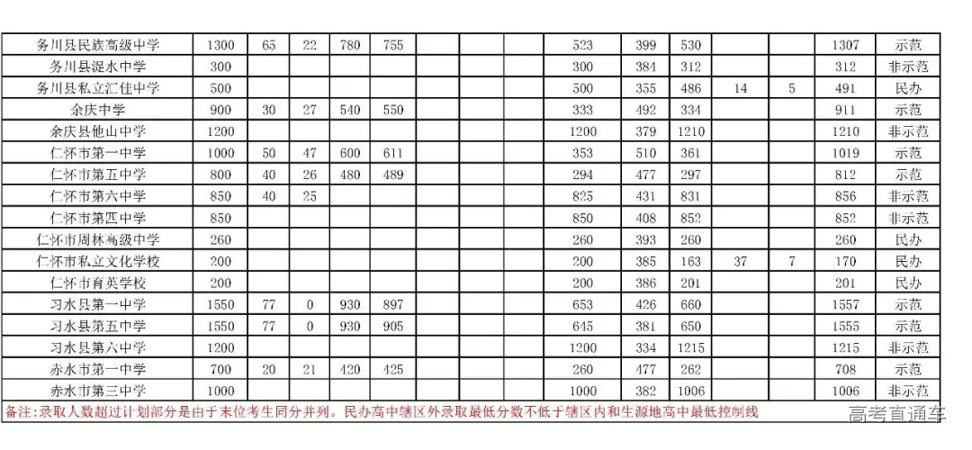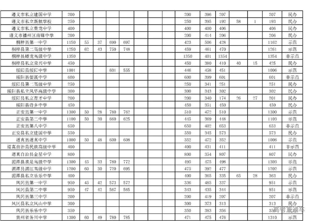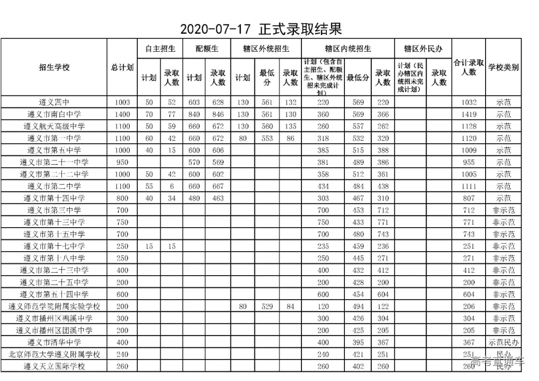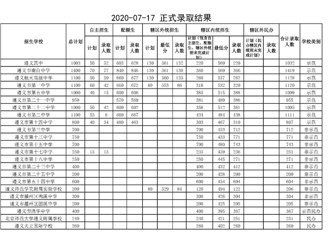 按照相关规定,学校录取分数线为各校“辖区内统招生”的最低分。而在遵义市的28所省级示范高中,遵义市第四中学和遵义市南白中学录取分数线最高,569分。其他示范高中录取线整体比去年的基础上有轻微下降或保持基本持平。 当地学生、家长比较关心的四所中学录取分数线为:四中569分 、南白中学569分 、航高557分 、一中532分。 安顺市2020年中考第一批次面向全市招生省级示范性高中录取控制分数线划定: 安顺市第一高级中学:543 分 安顺市第二高级中学:522分 安顺市民族中学:491分 西秀区高级中学:470分 平坝第一高级中学:485分 普定县第一中学:410分 关岭县民族高级中学:464分 紫云县民族高级中学:435分 安顺市第一高级中学、安顺市第二高级中学、安顺市民族中学特长生在其统招控制线下100分以内,从通过招生学校组织的体育、艺术特长生测试分类合格考生中,分类按特长测试成绩从高分到低分依次录取。 配额生在其统招控制线下50分以内,从有配额名额分配学校的考生中,按具备配额生录取资格考生的配额生志愿从高分到低分,依次录取。 第二批次分数线:(含面向县域招生的省级示范性高中) 安顺学院附中:408分 西秀区高级中学:470分 安顺市第三高级中学:414分 平坝第一高级中学:438分 普定县第一中学:471分 关岭县民族高级中学:465分 紫云县民族高级中学:415分 西秀区旧州中学:336分 镇宁县民族中学:344分 开发区高级中学:383分 其它一般普通高中统招录取控制线270分。 西秀区高级中学、平坝第一高级中学、普定县第一中学、关岭县民族高级中学、紫云县民族高级中学特长生在其统招控制线下100分以内,从通过招生学校组织的体育、艺术特长生测试分类合格考生中,分类按特长测试成绩从高分到低分依次录取; 配额生在其统招控制线下50分以内,从有配额名额分配学校的考生中,按考生第二批次统招一志愿从高分到低分,依次录取。
