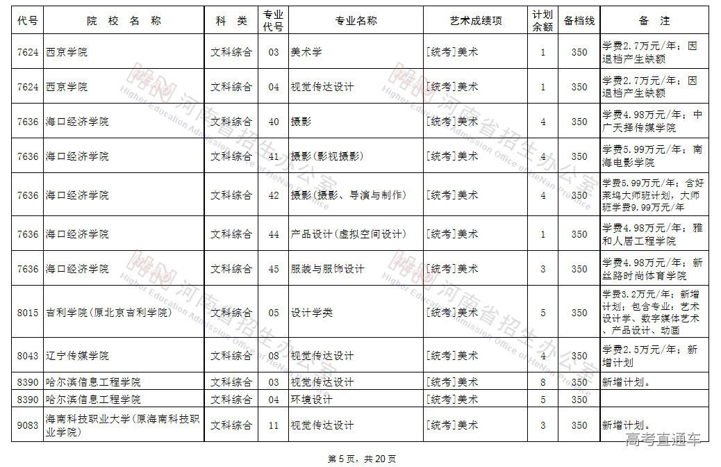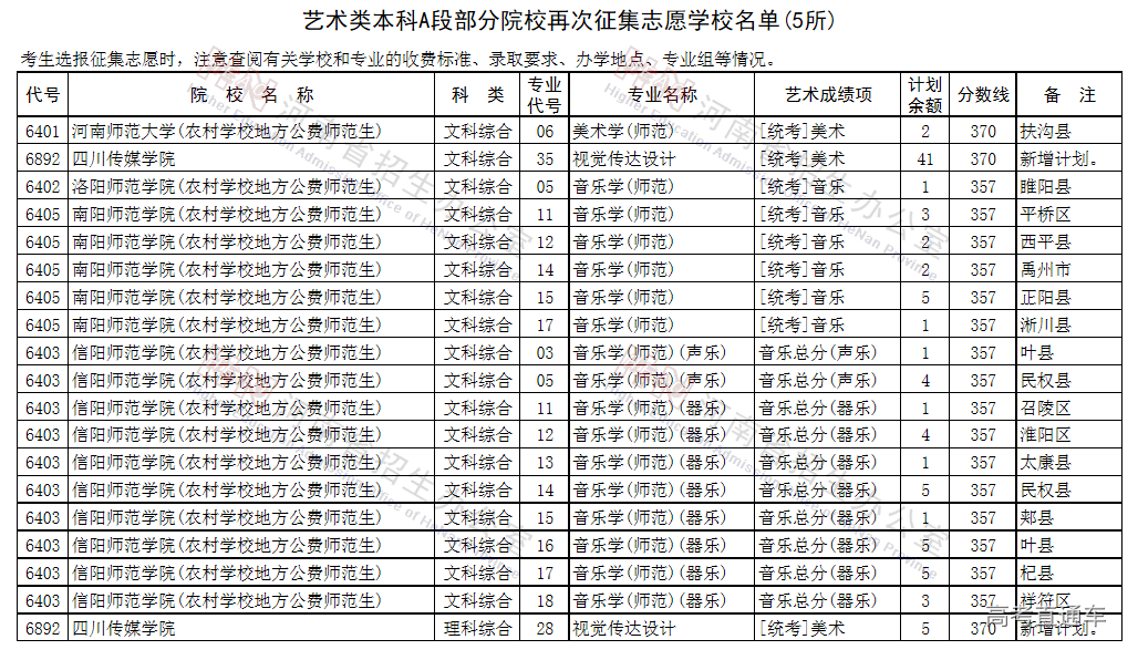 艺术类本科A段部分院校再次征集志愿学校名单(5所)