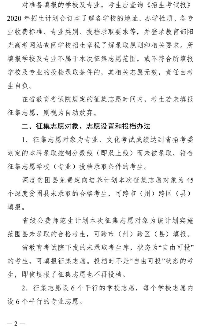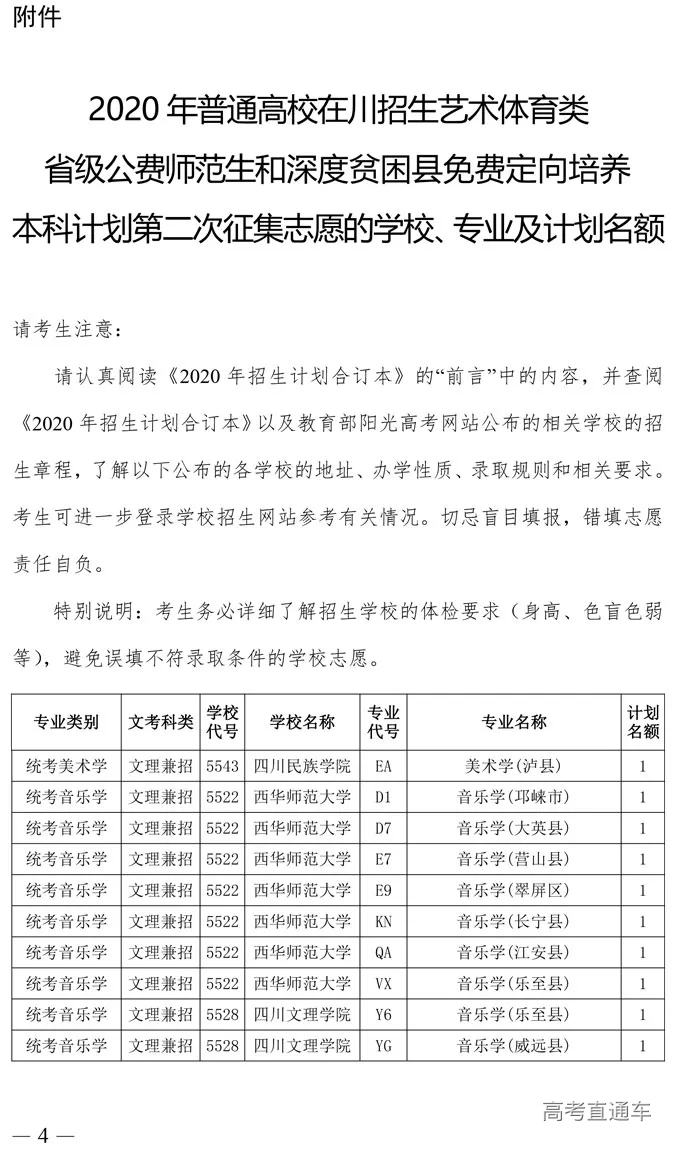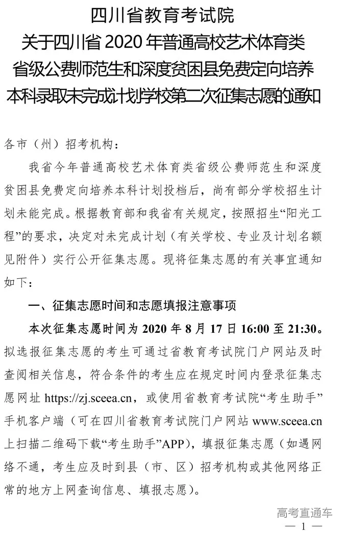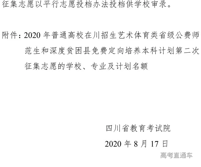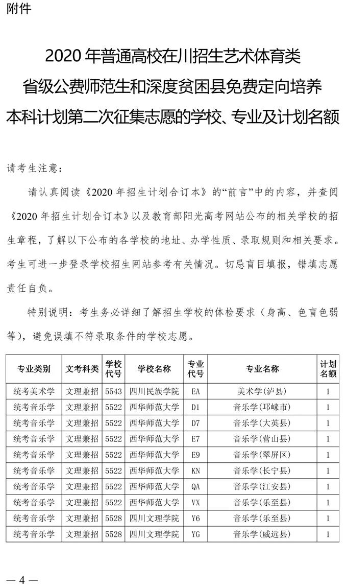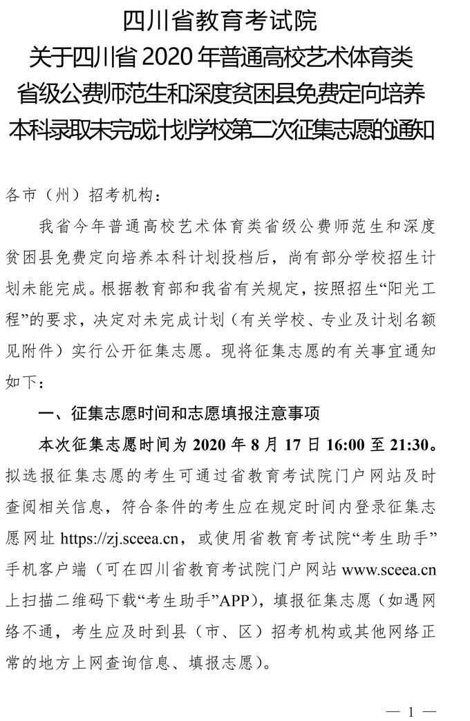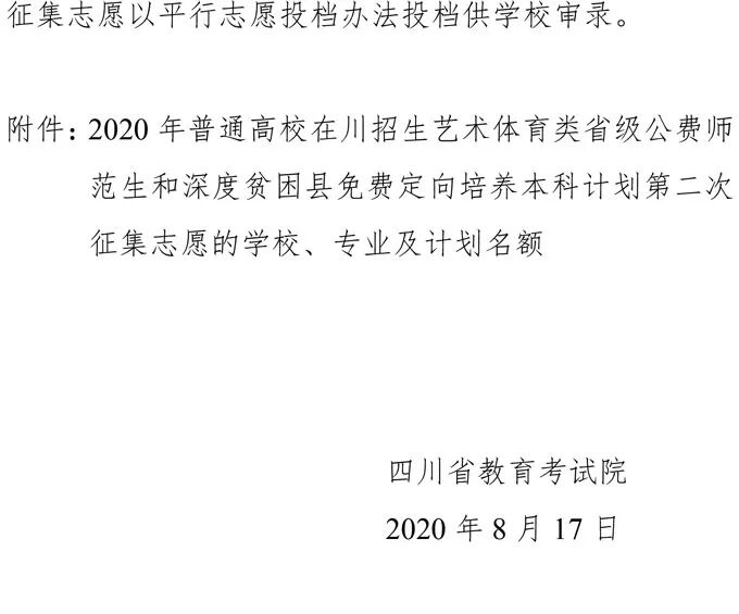 四川2020艺术体育类省级公费师范生、深度贫困县免费定向培养本科录取未完成计划学校第二次征集志愿的通知