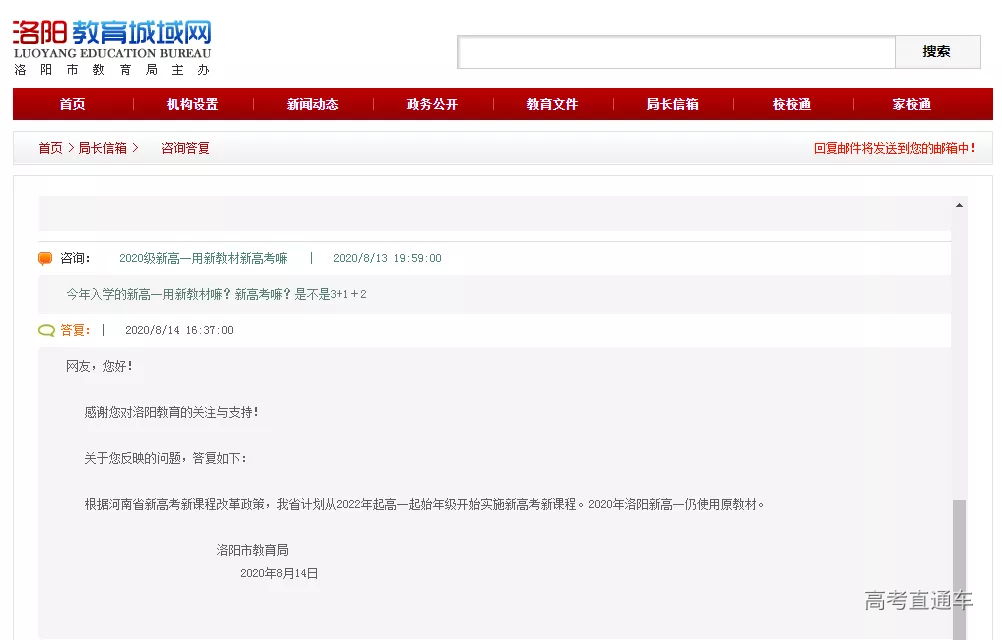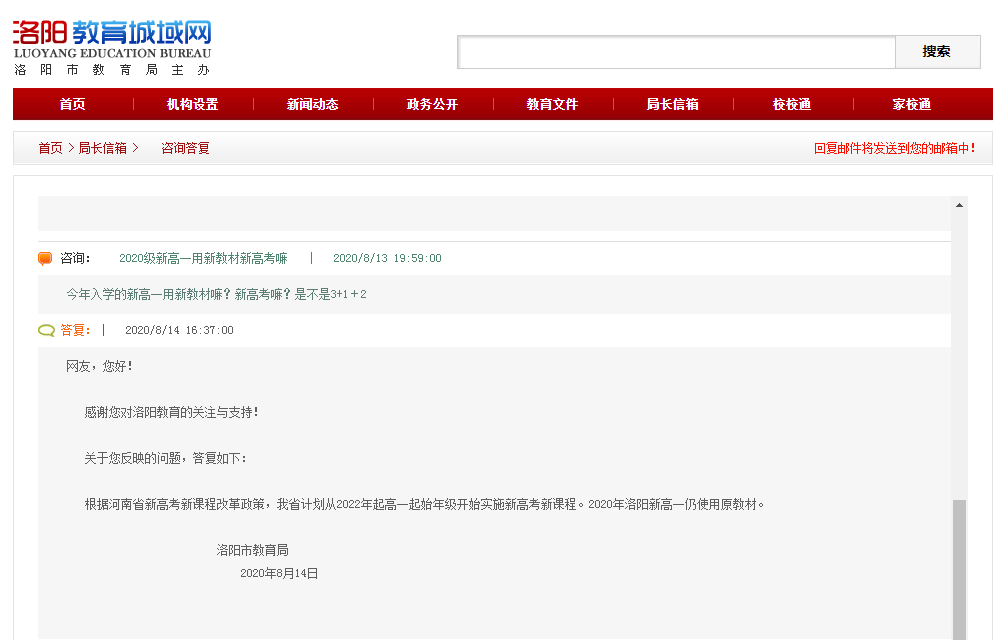 高考改革势在必行,而对已经习惯现有高考模式的学生来说,却不可避免地多了一份不安,高考大省河南更甚。有学生在升学之际向河南的教育局发文求证。对此,洛阳市教育局给出了正面回复:“我省计划从2022年高一开始实施新高考改革!”