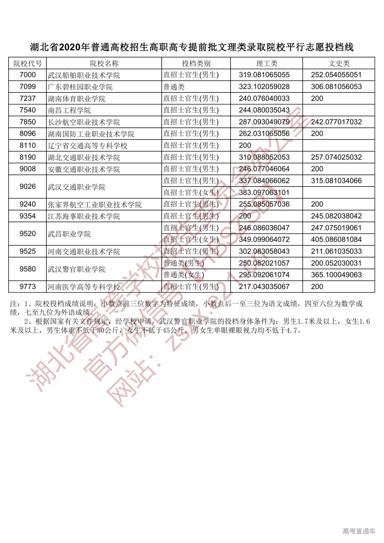 湖北2020年高职高专提前批文理类录取院校平行志愿投档线