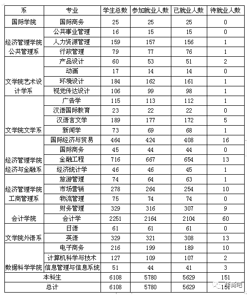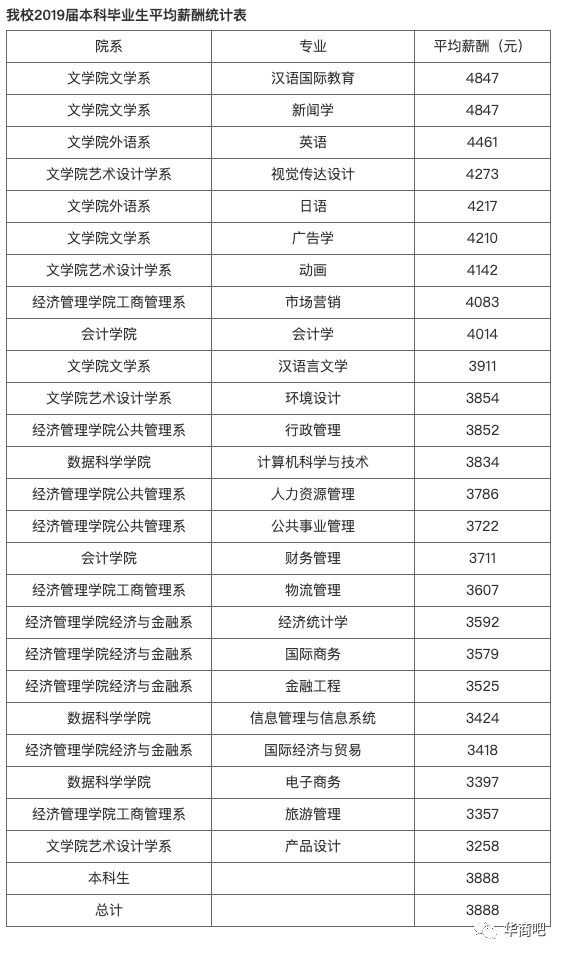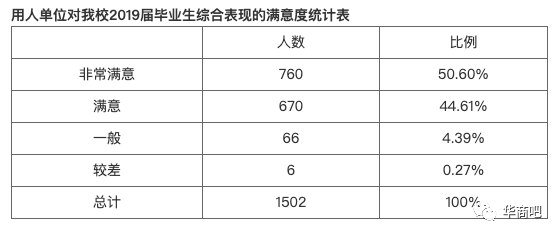 专业对口率可以反映某学科人才培养和市场需求之间的供需关系,也能侧面反应学校具体学科人才培养的质量,学科专业培养质量高,专业对口率就越高,学校2019届专业对口率如表6。 另外,我校2019届毕业生初次就业专业对口率在所在专业中,艺术设计学系动画专业对口率最高为100%;其次是广告学,为98.23%;再次是产品设计,为96.23%。专业对口率较低的为信息管理与信息系统、汉语国际教育、英语,分别为38.64%、31.82%、27.41%。总体来说,学校大部分专业对口率较高,在就业过程中所学专业与工作岗位较为匹配,能较好地发挥专业特长。从表中看,学校2019届毕业生就业的专业对口率平均为71.62%。其中,我校2019届毕业生初次就业专业对口率在其所在院系中,文学院艺术设计学系专业对口率最高,为93.87%;其次是经济管理学院经济与金融系,为81.80%;再次是会计学院,为76.05%;专业对口率较低的为国际学院、数据科学学院、文学院外语系,分别为64.00%、49.48%、39.94%。经过学校近几年的快速建设,为增大学校对企业的影响力,学校非常重视与世界500强和中国企业100强的企业接轨。很多进入世界500强和中国企业100强的学生,并且每年呈递增趋势。具体数据如表5。 学校2018届毕业生进入世界500强有154人,进入中国企业100强有161人。学校2019届毕业生进入世界500强有248人,进入中国企业100强有220人。相比于去年学校进入世界500强和中国企业100强的人数有很大的增长。大学生就业在线院校应用系统中的数据显示,我校2019年毕业生的平均薪酬约为3888元,其中最高的是汉语国际教育和新闻学专业,平均薪酬4847元;其次是英语为4461元;再次是视觉传达设计为4273元。因为此项数据统计时间刚好为毕业生入职的实习期或者试用期,数据显示为毕业生的入职工资,比毕业生实际薪酬低。具体数据见下表。 用人单位对我校毕业生综合表现非常满意为50.6%,满意为44.61%,满意度合计96%,这说明我校毕业生的综合素质得到用人单位的认可,反映出我校教学质量良好。 用人单位对我校本科毕业生专业技术能力、综合实践能力、沟通表达能力、人际协调能力、学习新知识能力、计算机应用能力、外语应用能力等的满意度都比较高。总的来说,用人单位对我校毕业生能力综合评价的满意度合计96.3%,请参看下表。总体来说,我校2019届毕业生就业情况呈现以下特点:1、初次就业率高。我校2019届毕业生初次就业率达到97.39%,高于全省平均水平,位居前列,这表明,我校的毕业生具备一定的就业竞争力,顺利实现就业不难。2、就业流向符合我校人才培养方案,大部分毕业生在粤港澳地区中小型企业就业,主要从事财会相关职业、服务业、行政事务类职业。4、就业层次相对较低。我校毕业生在政府机构、事业单位、国有企业的就业比例不高,主要集中于中小型私营企业的服务岗、行政事务岗。5、就业地区集中于经济发达城市。我校毕业生集中于粤港澳地区就业。我校毕业生在就业地区的选择上,观念存在偏差,盲目追求经济发达地区。6、逐步向世界500强及中国企业100强就业,提高学校就业质量。