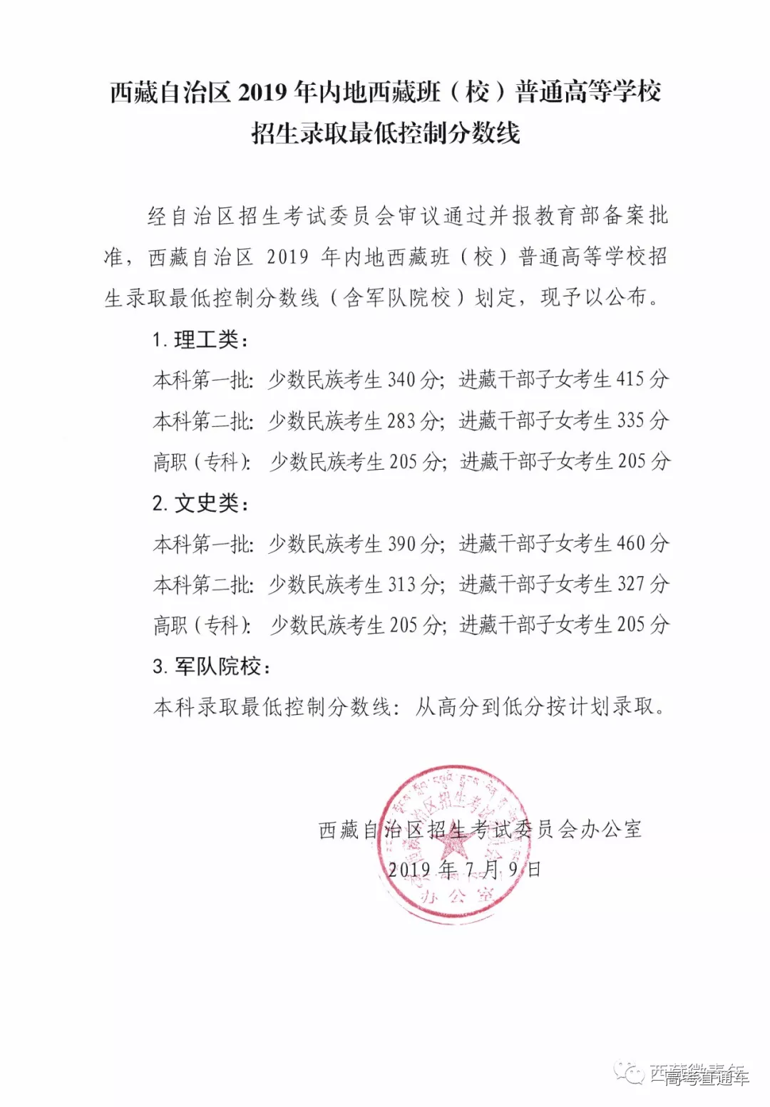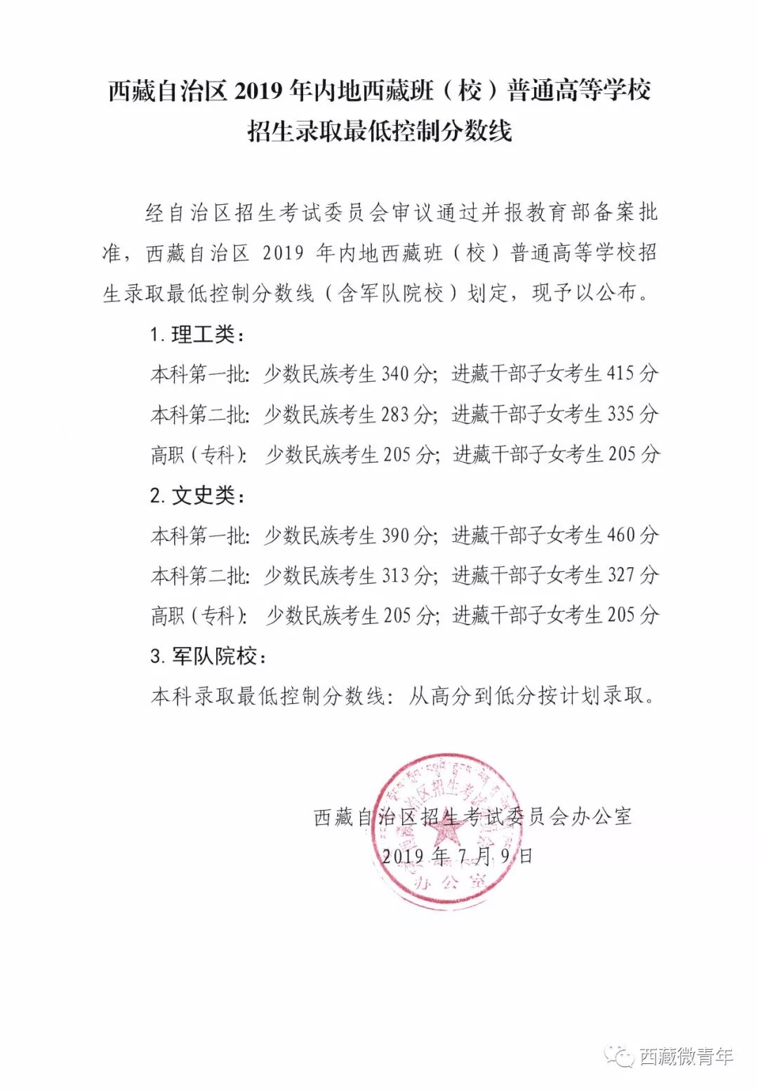 经自治区招生考试委员会审议通过并报教育部备案批准,西藏自治区2019年内地西藏班(校)普通高等学校招生录取最低控制分数线(含军队院校)划定,现予以公布: