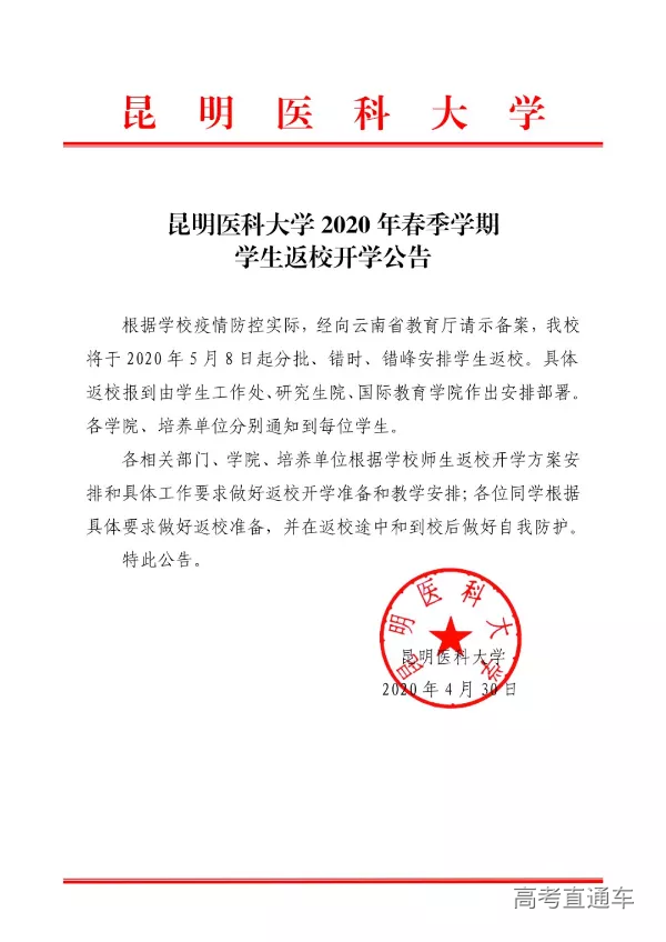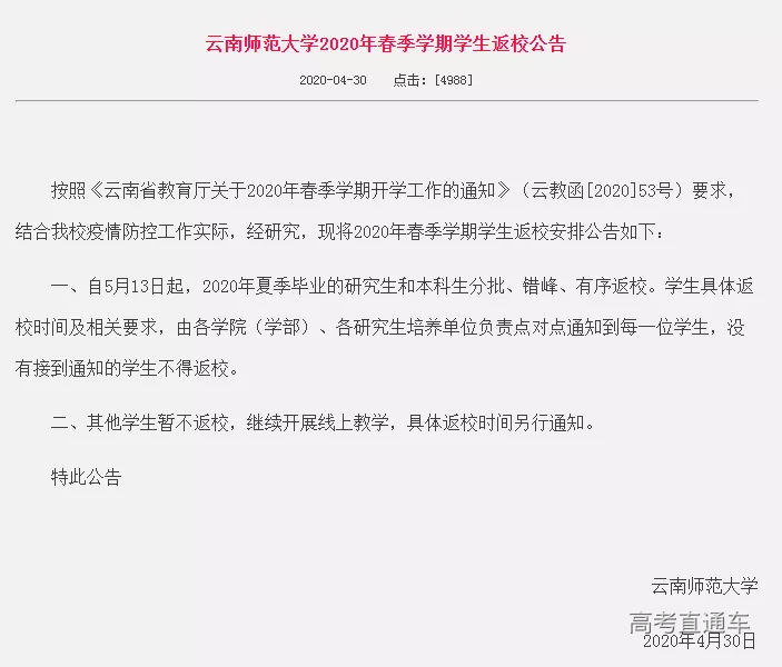 结合学校疫情防控工作实际,经研究,定于5月6日起启动毕业生学生返校,从5月11日起非毕业生分期、分批、有序返校。