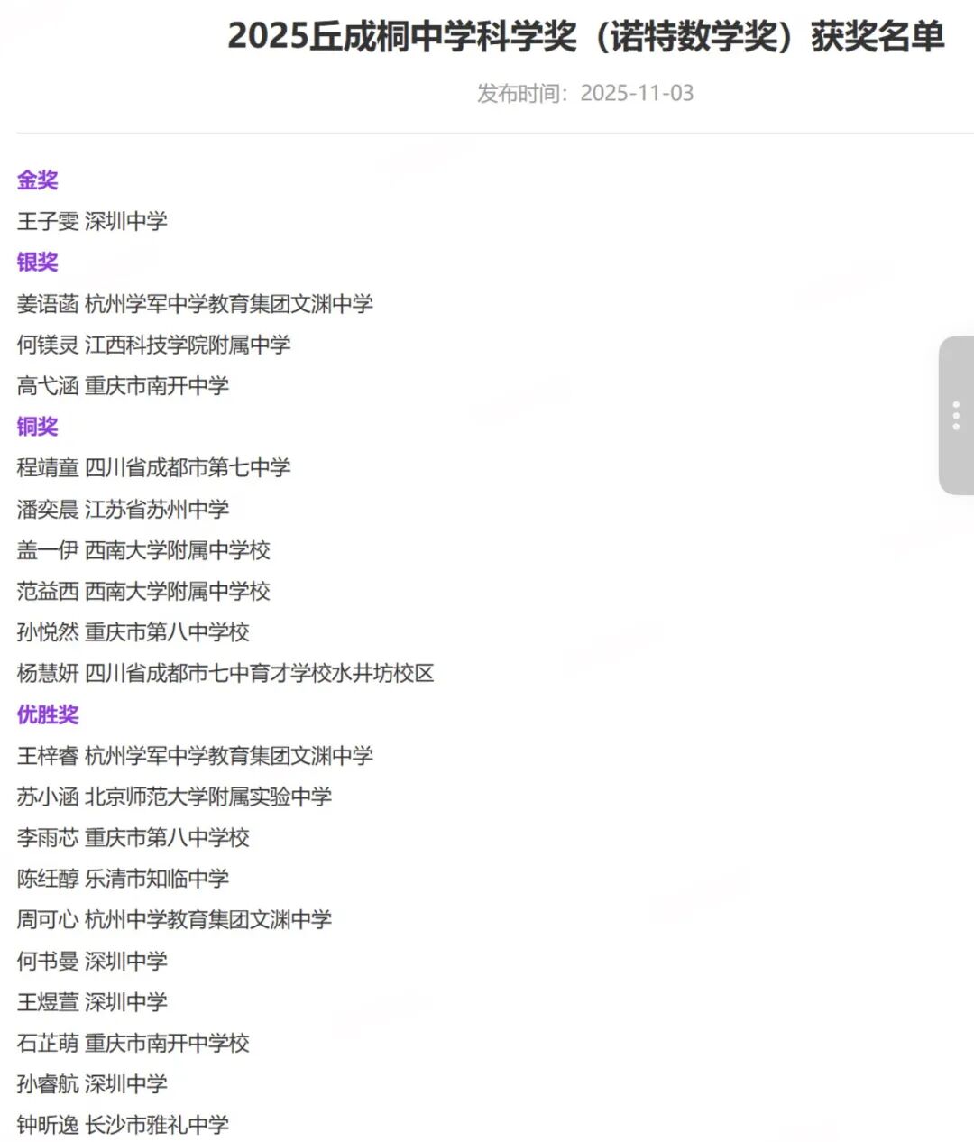 最新消息,2025年丘成桐中学科学奖(诺特数学奖)获奖名单发布!来自深圳中学的王子雯获得了唯一金奖,另有银奖3人,铜奖6人,优胜奖10人,恭喜各位获奖同学。高考直通车第一时间汇总整理,大家一起来看!
