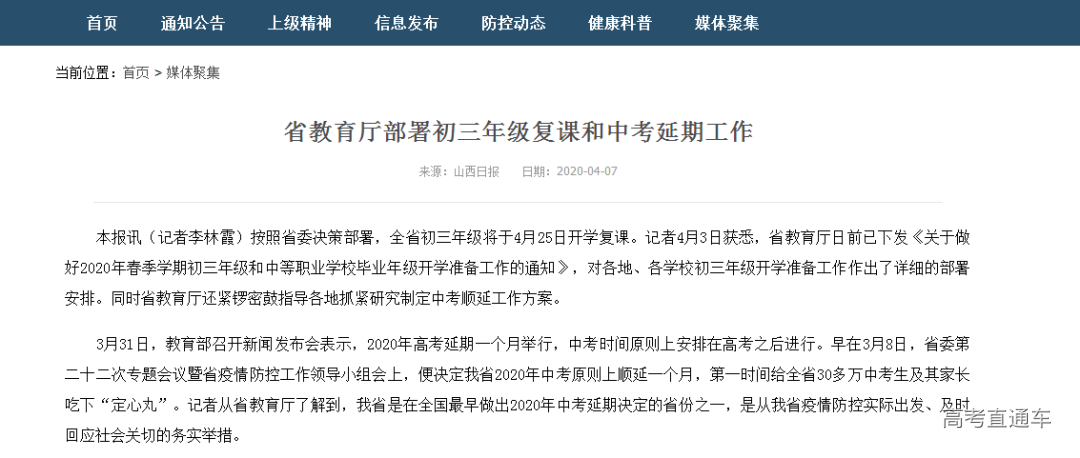 3月31日,教育部召开新闻发布会表示,2020年高考延期一个月举行,中考时间原则上安排在高考之后进行。早在3月8日,省委第二十二次专题会议暨省疫情防控工作领导小组会上,便决定山西省2020年中考原则上顺延一个月,第一时间给山西省30多万中考生及其家长吃下“定心丸”。