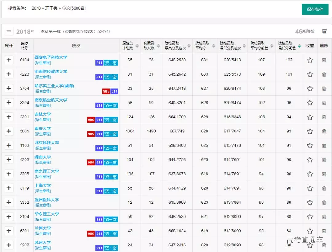 ☝ 通过位次法快速筛选出历年录取考生位次包含“5000名”的一本院校