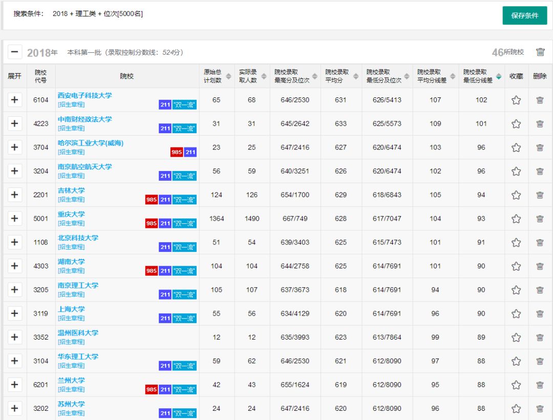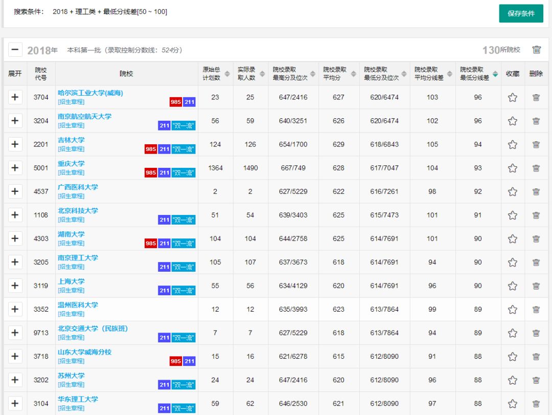 ☝ 通过分差法快速筛选出历年录取线上分数差为“50分-100分”范围的一本院校