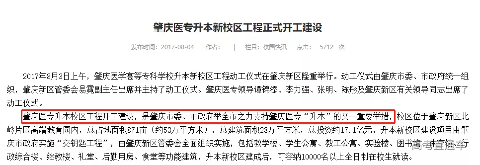 肇庆医学高等专科学校前身中山大学医学院肇庆分院,2017年开始专升本新校区迁建,总投资高达17.1亿元,开设开设临床医学、护理、口腔医学等18个本科专业。