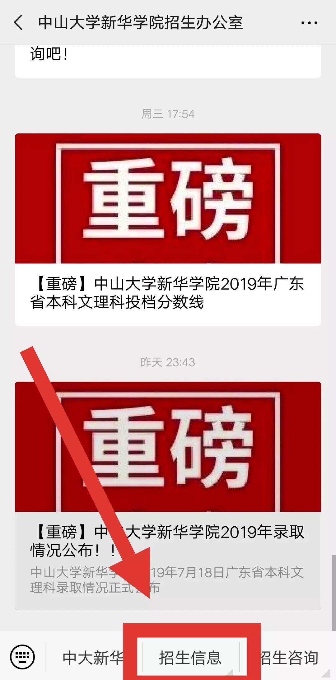 (一)“中山大学新华学院招生办公室”官方微信公众号查询