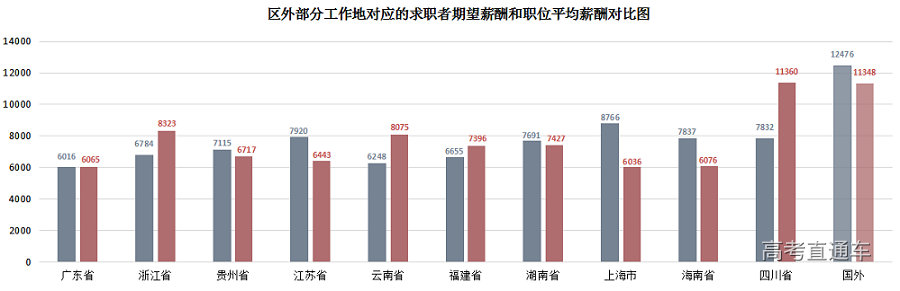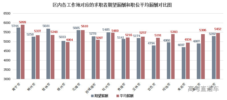广西人才网中各工作地对应的求职者期望薪酬和职位平均薪酬如下图(单位:元/月):