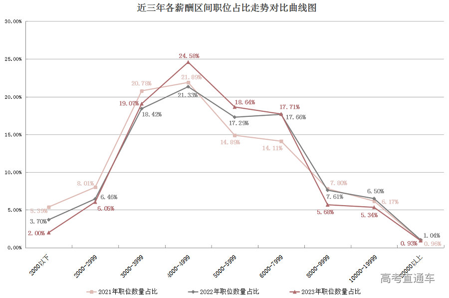 如上图所示,近三年来广西人才网中的薪酬区间分布曲线逐渐趋向集中。较低和较高薪酬区间的职位数量占比均出现显著下滑,而主要薪酬区间的职位数量占比则出现了明显的增长。
