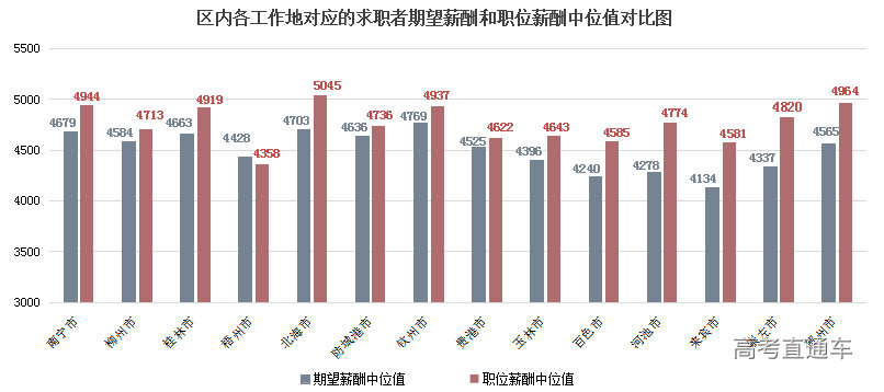 广西人才网中各工作地对应的求职者期望薪酬和职位薪酬中位值如下表(单位:元/月):