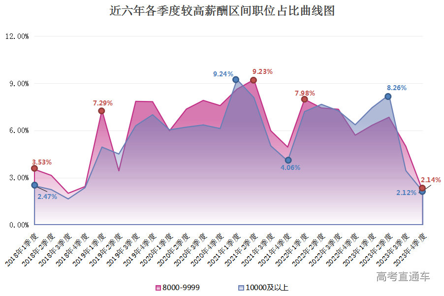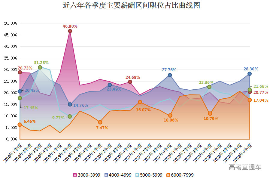 3.近六年各季度较高薪酬区间(单位:元/月)的职位数量占比曲线图如下: