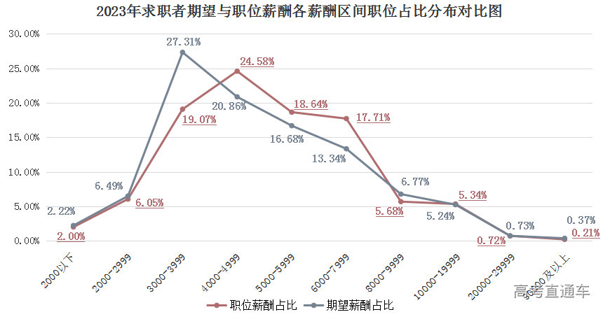 2023年,求职者对于薪酬的期望与市场实际水平之间存在不匹配现象,尤其在主要薪酬区间,这种差异更为明显。