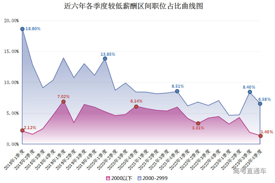 由上图可见,近六年2000以下元/月薪酬区间逐年下滑,尤其是在2023年第四季度,该区间的职位数量占比仅为1.40%,这是近六年来的最低值。而2000-2999元/月薪酬区间虽然在某些季度有季节性增长,但整体上也有下滑趋势,在2023年第四季度,该区间的职位数量占比为6.58%。