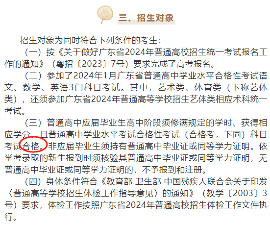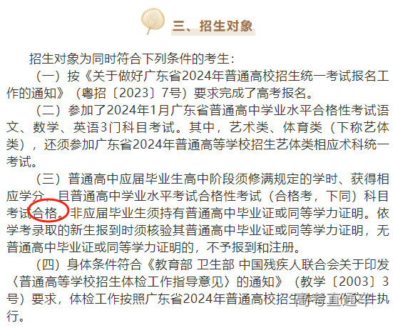 根据省考试院此前发布的《关于做好广东省2024年普通高校招生统一考试报名工作的通知》,再次明确了“必须在2024年7月前通过高中学业水平考试,并取得高中学历,才能参加高考录取和入学”!