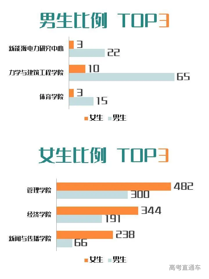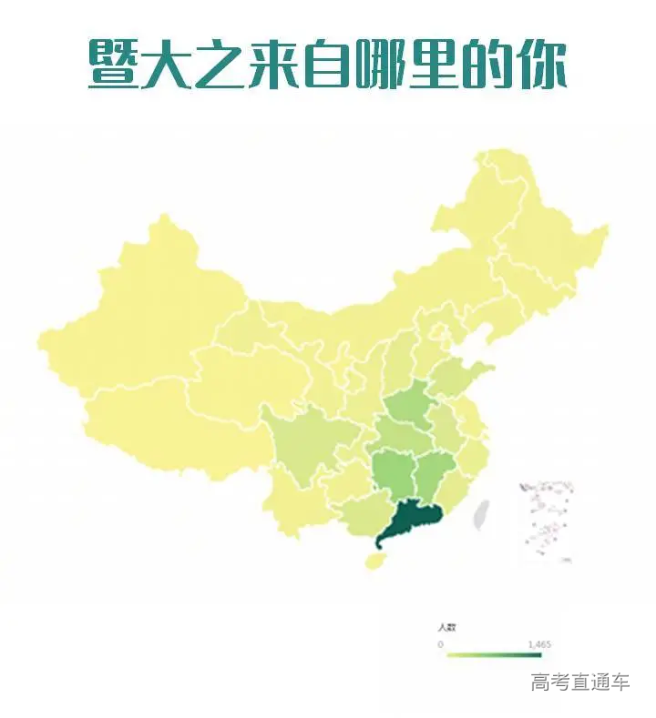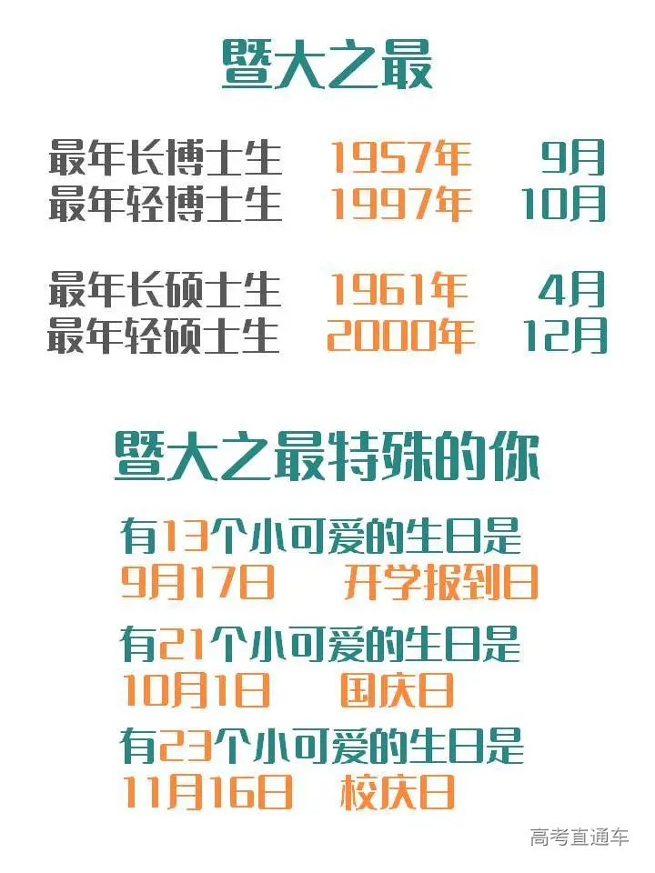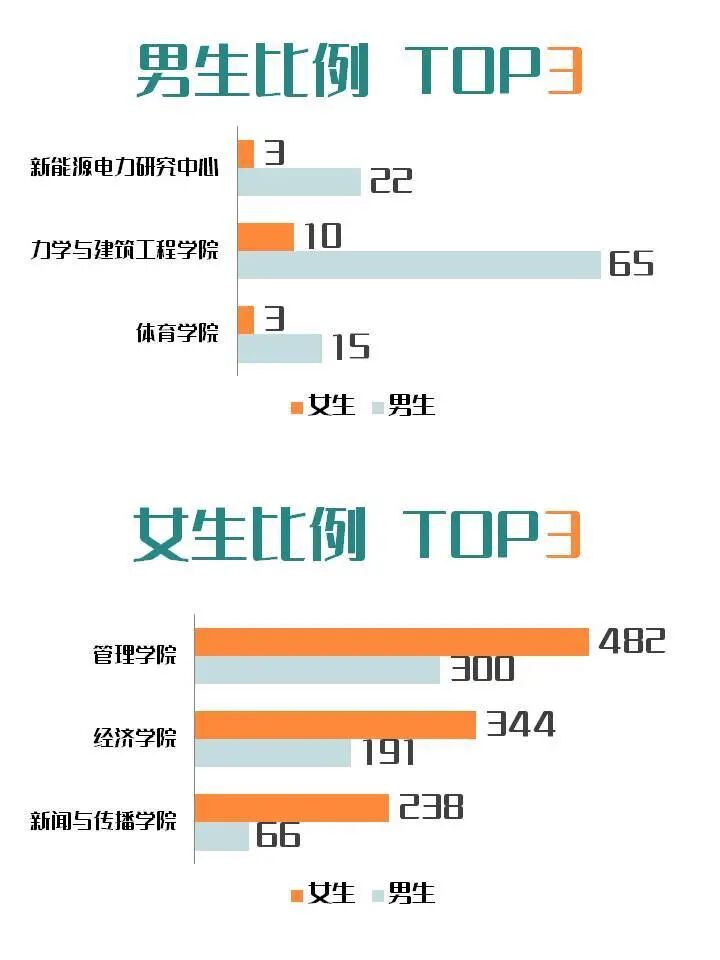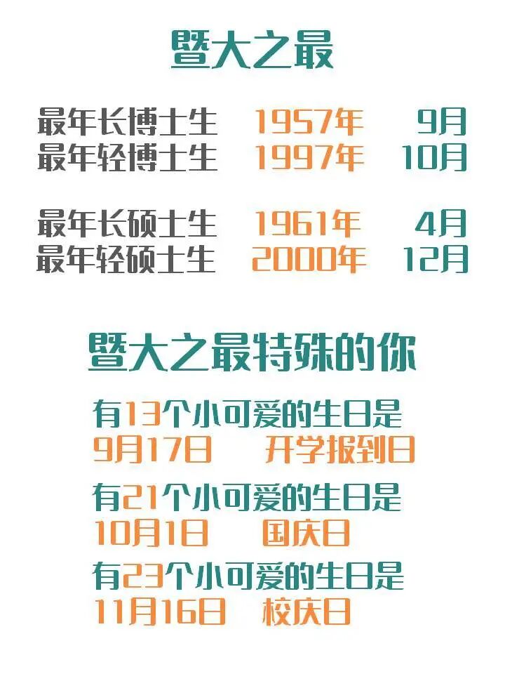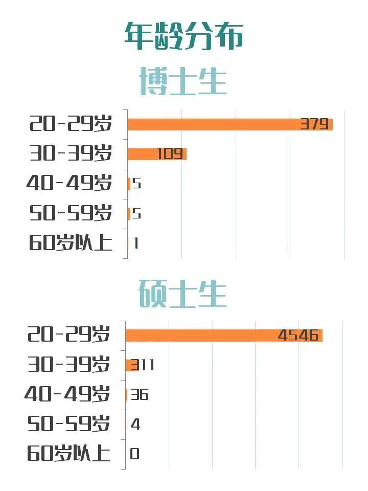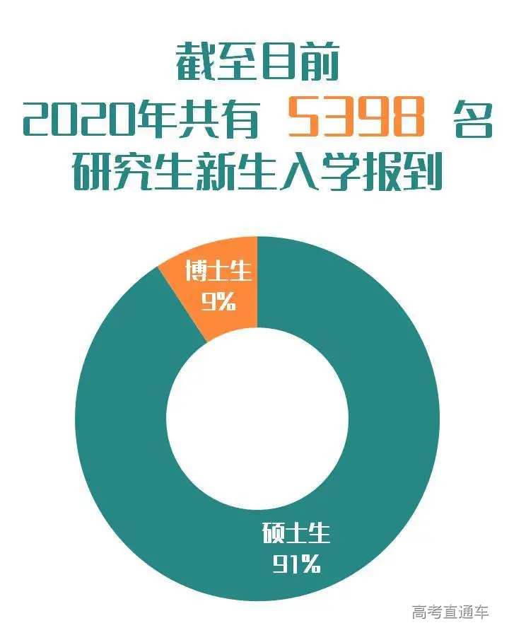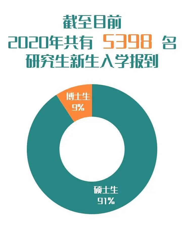 01 招生情况概览 截止到9月29日,2020级秋季报到研究生共5398人,其中硕士研究生4899人,占比90.76%,博士研究生499人,占比9.24%。 跟2019年相比,今年的研究生新生数量增加了1154人,近30%。 难怪官微君感觉今年学校里的新鲜面孔格外的多呢~ 在全体研究生新生中,全日制研究生共4804人,非全日制研究生共594人,比例约为8.9∶1.1。 02 男女比例 在今年报到的研究生中,男生2139人,女生3259人。男女比例约为4∶6,平均每100个人中有40个男生,60个女生。 是不是已经为“脱单”做好了充分准备~ 其中硕士男生有1870人,女生有3029人,男女比例约为4:6;而在博士研究生中,男生有269人,女生有230人,男女比例几乎达到1∶1。 男生比例最大的是新能源电力研究中心,男女比例达到了8.8∶1.2;位列第2、第3名的分别是力学与建筑工程学院和体育学院,他们的男女比例分别是8.7∶1.3和8.3∶1.7。 女生占比最多的是新闻与传播学院,男女比例达到了2.2∶7.8!其次是经济学院和管理学院,男女比例分别是3.6∶6.4和3.8∶6.2。 现在知道要和什么学院一起举办联谊会了吗~ 03 院系分布 纵观所有院系,招生人数前五名的学院分别是:管理学院782人;经济学院535人;生命科学技术学院365人;第一临床医学院335人;信息科学技术学院309人。 管理学院招生人数已经连续几年稳坐“暨大第一大院”的宝座,信息与科技学院第一次冲进了榜单前五。 管理学院的工商管理专业是暨大所有专业中招生人数最多的,今年的录取人数更是突破了300大关。信息与科技学院的电子信息专业录取人数达到了256,新闻与传播学院的新闻与传播专业一直是暨南大学的热门专业之一,录取人数达到172人。 04 年龄分布 截至目前,已报到的硕士博士研究生,大部分年纪处于20-29岁之间。 其中,最年轻的硕士研究生出生于2000年12月,今年20岁,最年轻的博士研究生今年也只有23岁。 年龄最大的硕士研究生出生于1961年4月,今年59岁,最年长的博士研究生则出生于1957年,今年已经63岁。 学海无涯,值得用一生求索。00后和60后们,欢迎来到暨南园! 05 生源地 素有“小联合国”之称的暨南大学,已报到的港澳台侨研究生共有272人,占20级新生总数的5%;已报到的来华留学生共有64人。 2020级内招生的家乡遍布全国,来自34个省级行政区,其中广东、湖南和江西的老乡最多:广东1620人,占比32.2%;湖南522人,占比10.3%;江西522人,占比10.3%。 06 民族大融合 截至目前,有215位同学是少数民族,占新生总体比例的4.3%,他们来自24个少数民族,其中人数排名前三位的少数民族分别是壮族、土家族和回族。 07 姓氏分布 姓“李”的人数最多,共有351位。此外,陈、王、张、刘这几大姓氏也占据半壁江山。 是不是已经有好几个寝室变成“李氏家族”了? 友情提示:李敏、张琦、高洁、黄涛、刘磊、刘璐、李婷、李思敏几位同学请注意,你们有好几位同名同姓的小伙伴哦~ 08 生源院校 暨南大学研究生生源遍布全国数百所高校,其中生源特别多的分别有暨南大学、华南农业大学、江西财经大学、广东医科大学、湘潭大学、华南师范大学、广东外语外贸大学、广州大学、广东药科大学、广东财经大学等高校。