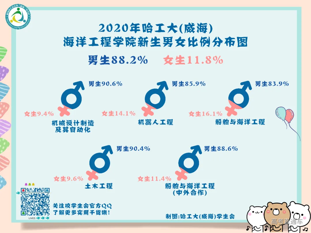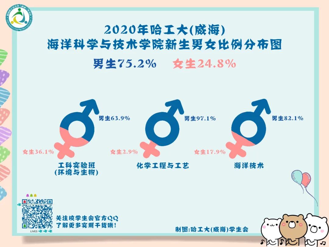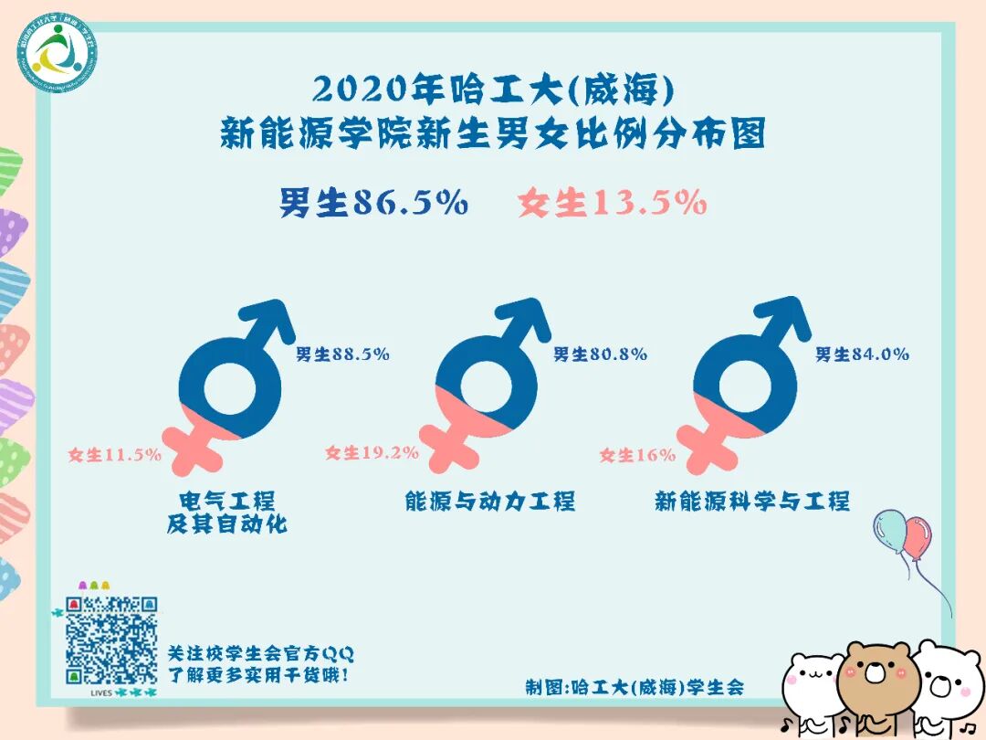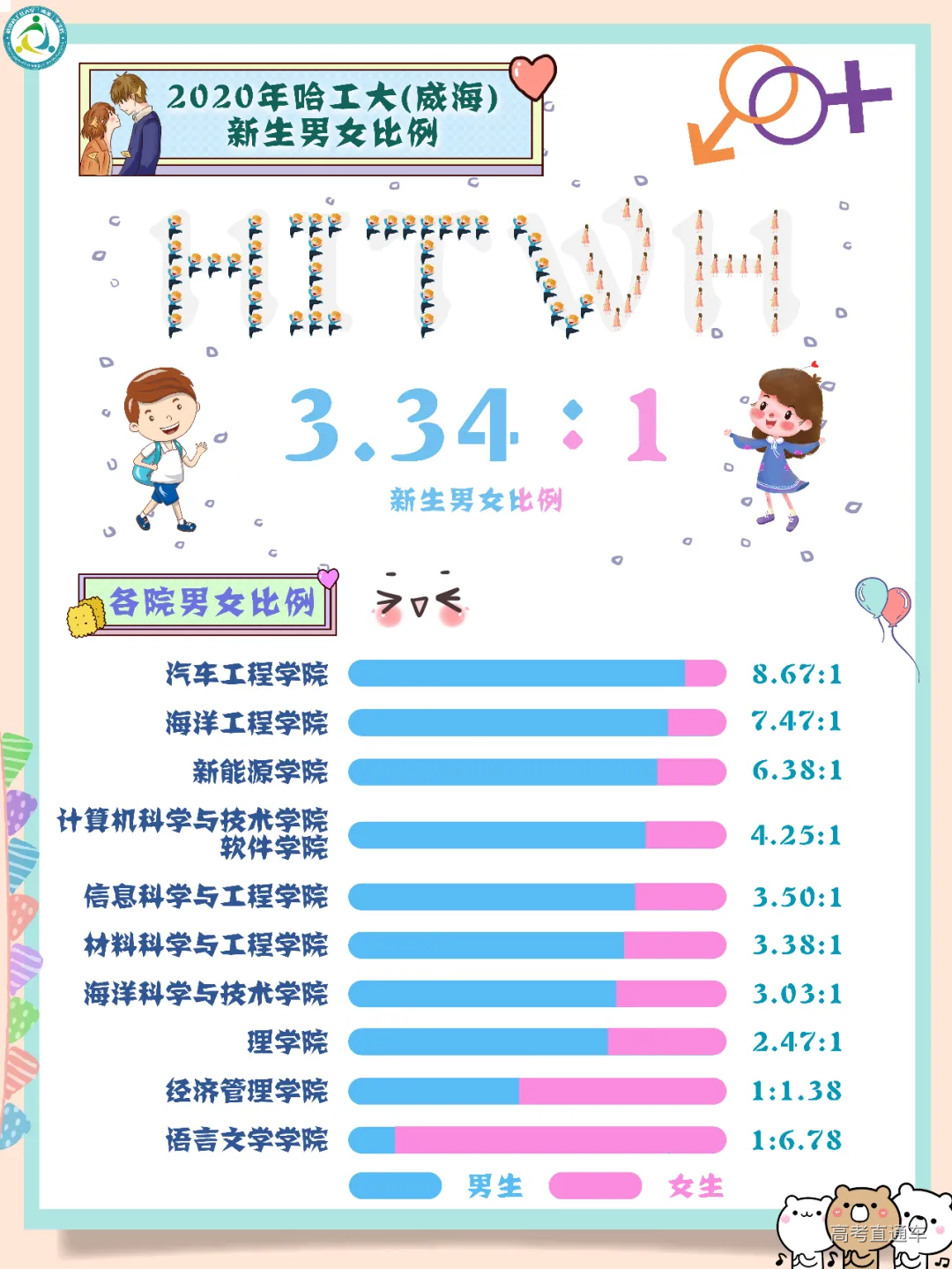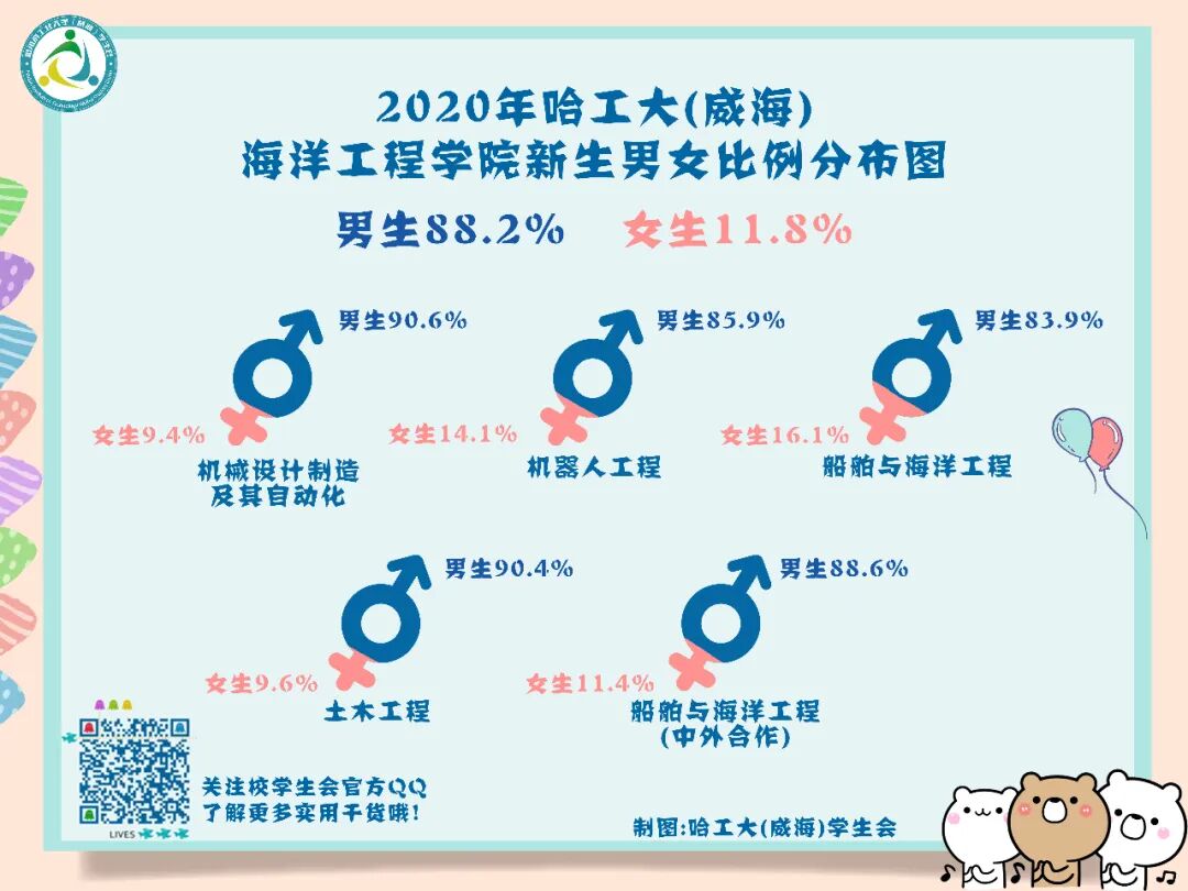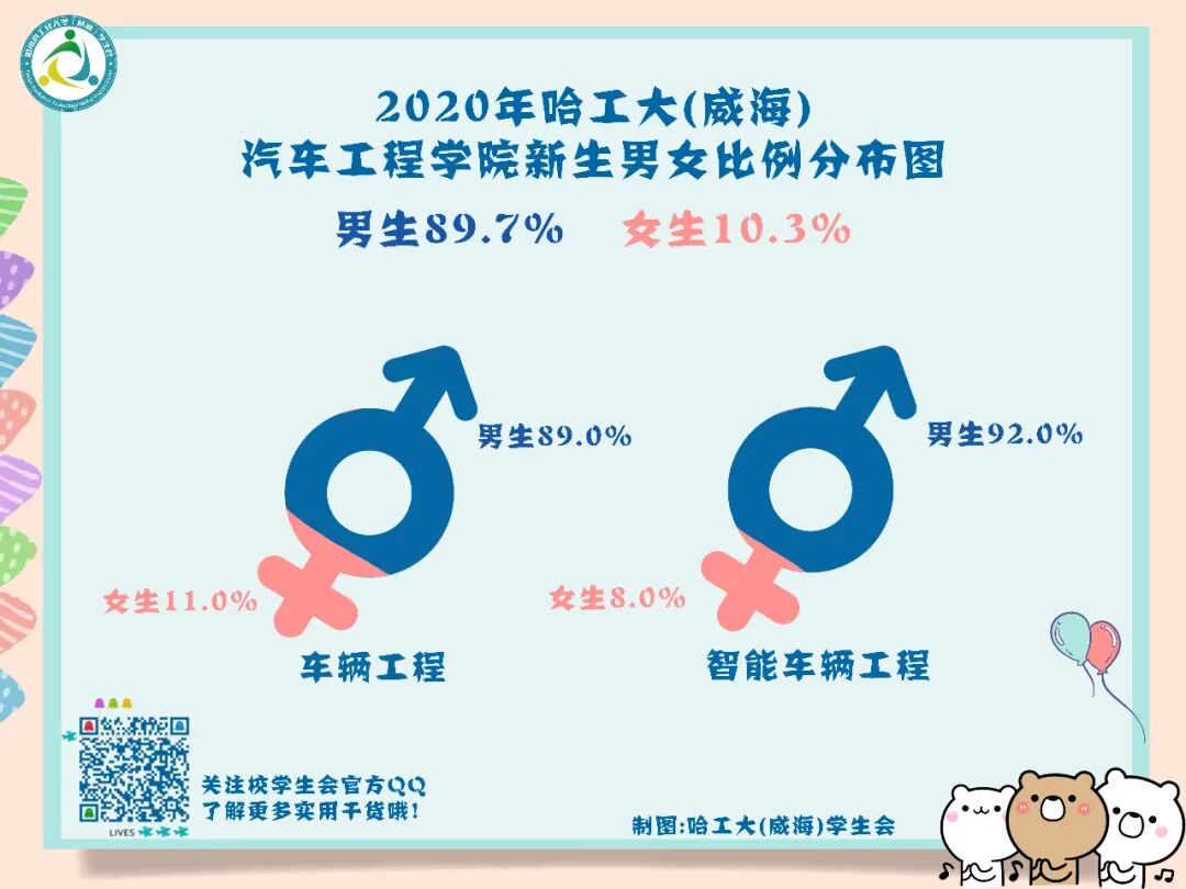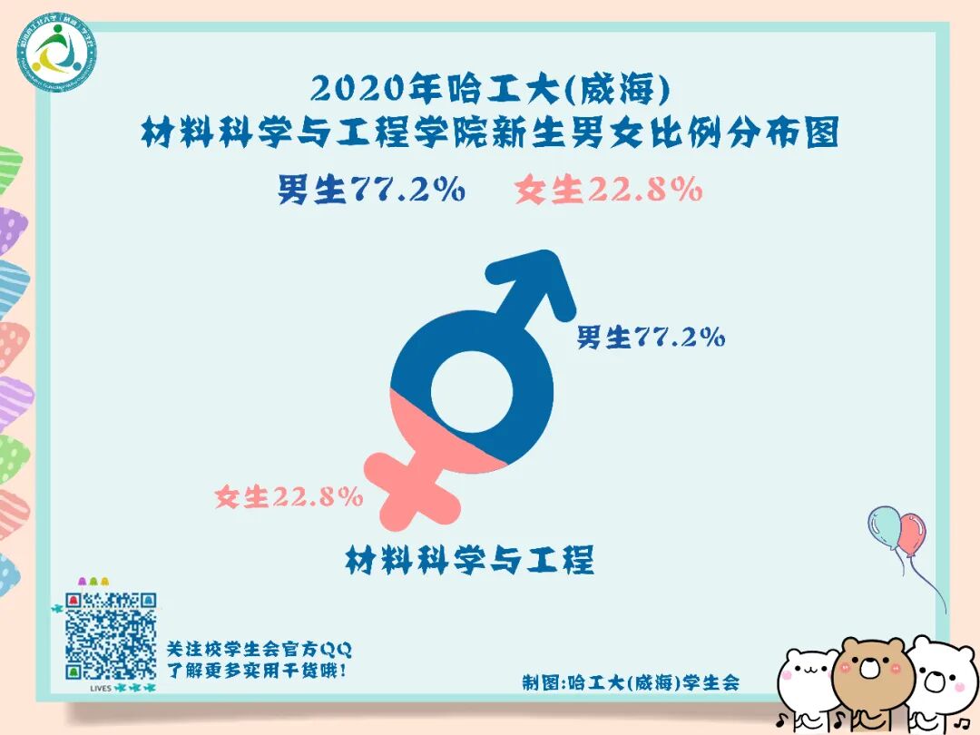 2020级新生的男女比例为3.34:1,比去年的3.05:1略有增加,坚持了哈工大男多女少的传统。工大的女生虽然在数量上不敌男生,但是质量上和男生无差,我们都是好样的!