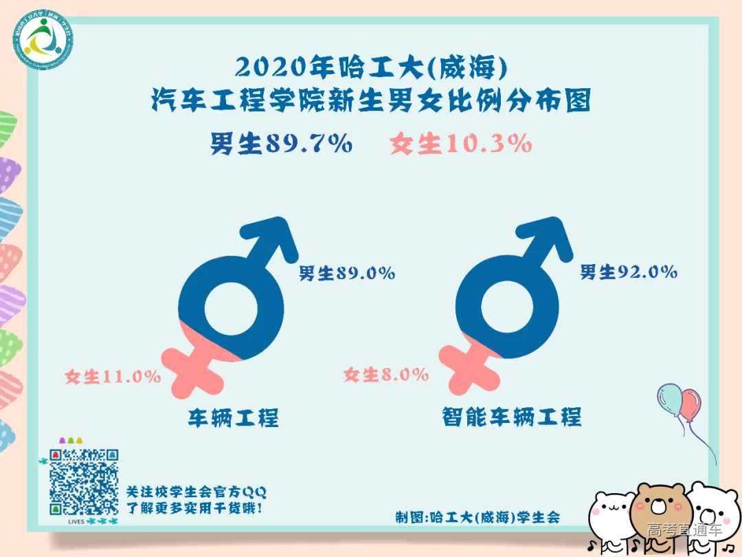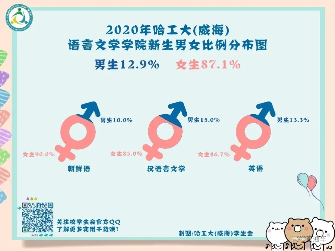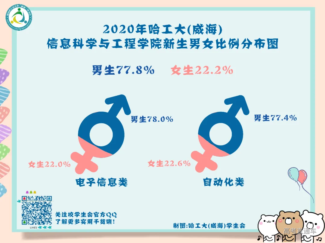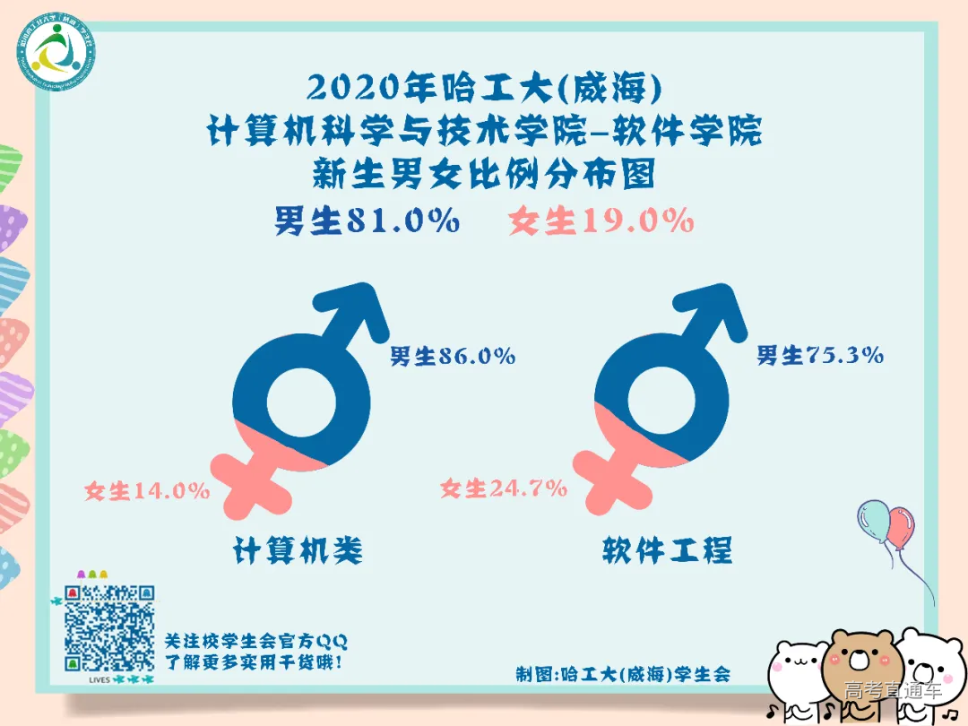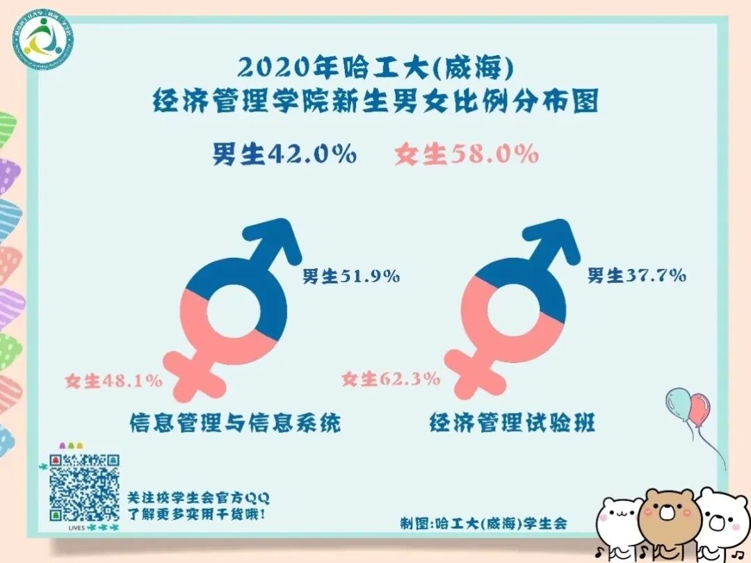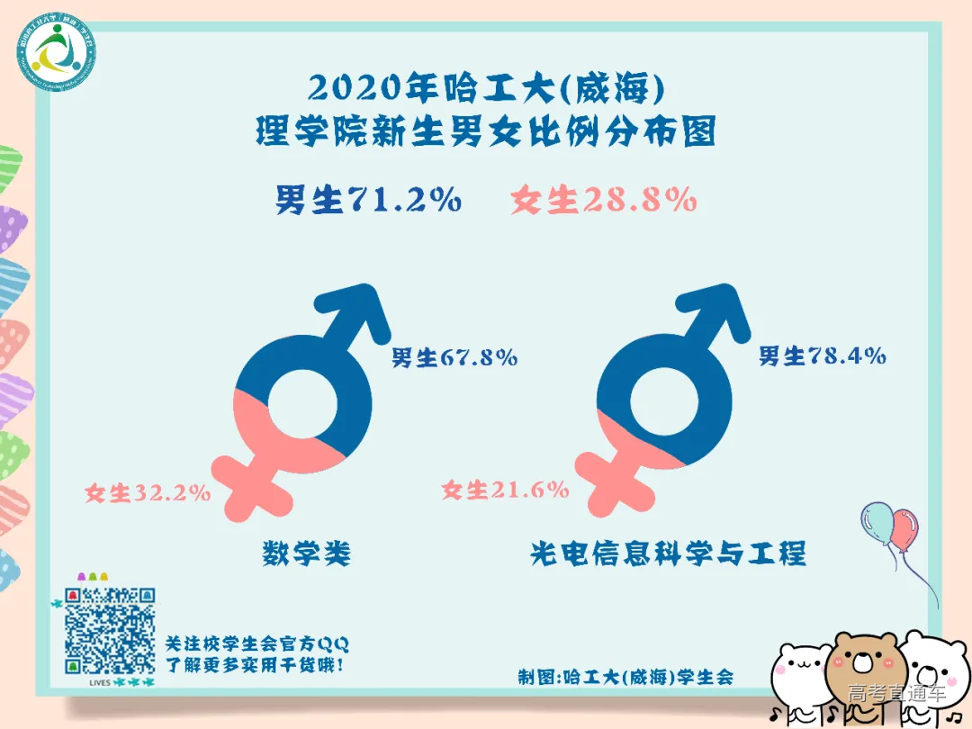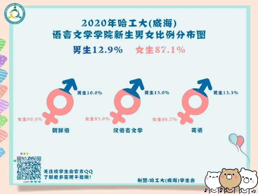 2020级新生的男女比例为3.34:1,比去年的3.05:1略有增加,坚持了哈工大男多女少的传统。工大的女生虽然在数量上不敌男生,但是质量上和男生无差,我们都是好样的!