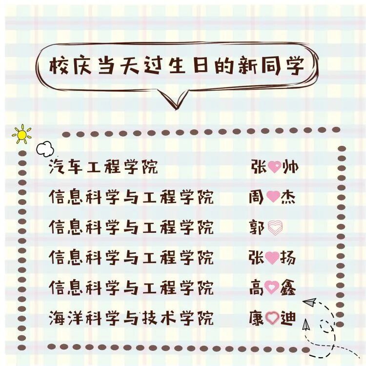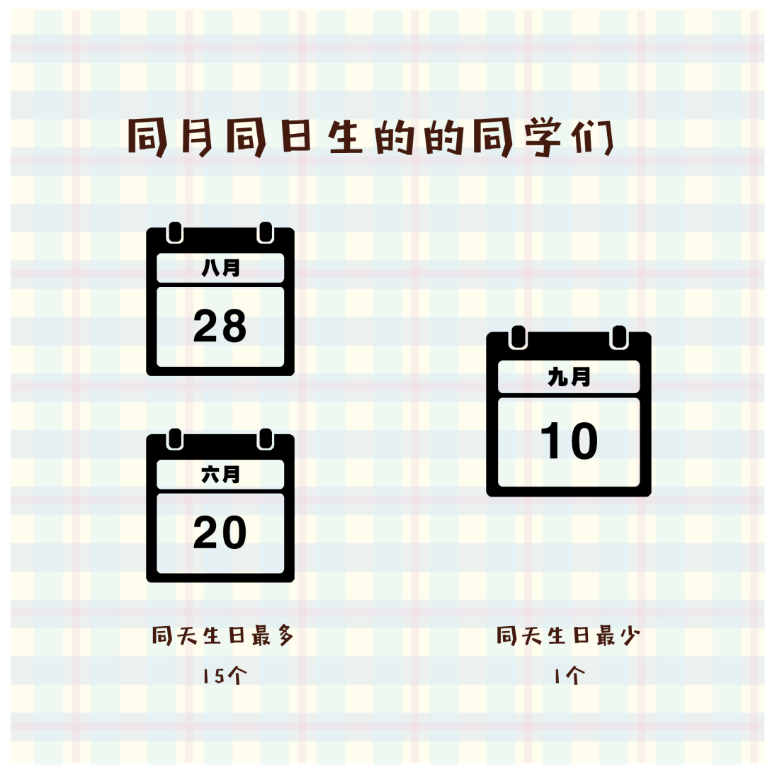 其中在6月20日和8月28日过生日的同学最多,有15人,在9月10日过生日的同学最少,仅有1人。最惊喜的是还有6位同学与哈工大同一天过生日!