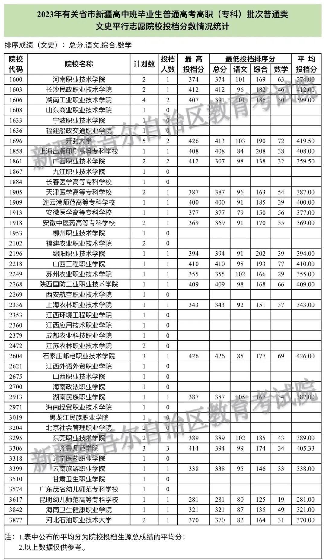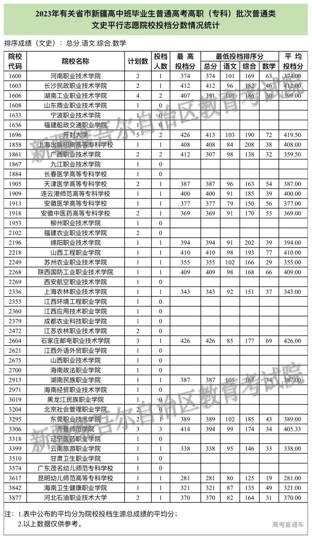 按照录取工作安排,2023年有关省市新疆高中班毕业生普通高考招生录取高职(专科)批次8月14日正式投档。录取现场工作组根据投档原则进行了投档,并通知相关院校及时接档、阅档,要求其按照录取原则及招生章程进行录取。目前,各录取环节工作有序进行,现将各院校投档情况公布如下。
