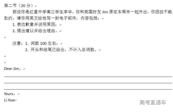 在应用文写作部分,“李华”再次出现。今年的李华依旧是红星中学高三学生。今年,李华和英国好友Jim原定本周末一起外出,因故不能赴约。因此作文即要求李华给Jim写一封英文道歉邮件,向Jim表达歉意、说明原因,提出建议、给出理由。