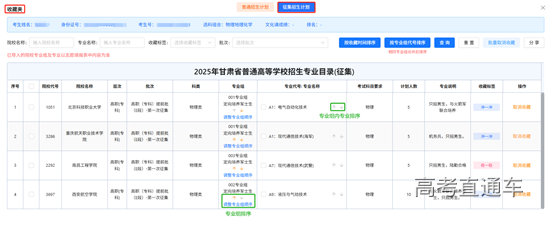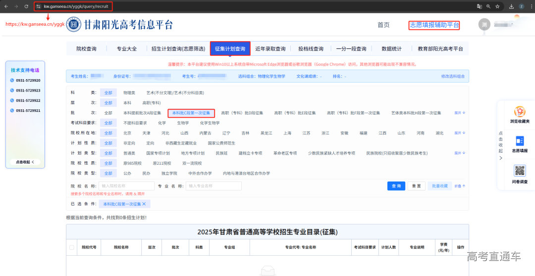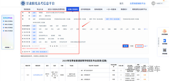 1.登录系统 考生可访问甘肃省教育考试院官网(https://www.ganseea.cn),点击“甘肃省国家教育考试综合管理平台”进入后选择“考生入口”进入考生服务平台登录页面,也可直接输入网址:http://kw.ganseea.cn/login,打开考生服务平台登录页面登录。登录后点击“志愿填报辅助平台”进入“征集计划查询”模块进行查询。 或点击“甘肃阳光高考”图标进入甘肃阳光高考信息平台,也可直接访问甘肃阳光高考信息平台:https://kw.ganseea.cn/yggk,登录后进入“志愿填报辅助平台”模块,点击“征集计划查询”查看计划信息。 2.志愿填报系统与志愿填报辅助系统相互切换 考生可在“甘肃省国家教育考试综合管理平台-考生服务平台”中通过点击左侧菜单“志愿填报辅助平台” 或在“志愿填报”菜单中点击“志愿填报辅助平台”按钮切换到志愿填报辅助平台。 考生可在志愿填报辅助平台右侧边栏中点击“志愿填报”图标进入志愿填报系统。 3.征集计划查询 在志愿填报辅助平台“征集计划查询”模块根据筛选条件检索征集志愿。 4.志愿收藏及收藏夹查看 考生可以点击专业右侧操作中“收藏”按钮将专业添加到不同标签的收藏夹下,或者勾选专业选择框,点击“批量收藏”按钮进行收藏。在收藏夹中可以通过“上移”、“下移”图标对专业组或专业组内专业进行排序。 5.一键导入志愿系统 考生填报征集志愿时,必须在志愿填报系统内进行填报,进入志愿填报系统方法可参考本指南第2步说明。 考生可以点击右侧“从收藏夹批量导入”按钮,或志愿右侧“单个志愿导入”按钮,将考生在志愿填报辅助系统中,已添加到收藏夹的专业批量或单个导入到志愿填报中,导入时可以通过“上下移”按钮调整专业顺序,需要注意导入志愿会覆盖当前已填报的志愿。 6.提交志愿 考生确认填报完成后,需要点击“提交”按钮,在提交弹窗中使用本人账号绑定的微信扫描二维码获取提交码,输入提交码后进行提交,操作与删除已填报志愿时一致。 7.预览已提交志愿 请考生务必仔细确认所填报志愿,时间截止前可多次修改提交。考生可通过点击右侧“预览志愿按钮”,弹出已填报的志愿预览页面。在弹出页面左侧是志愿批次的列表,通过点击对应批次切换当前预览的志愿内容。 注意:本操作指南中所展示的计划数据仅用于测试,考生填报志愿过程中须以实际公布的计划为主。