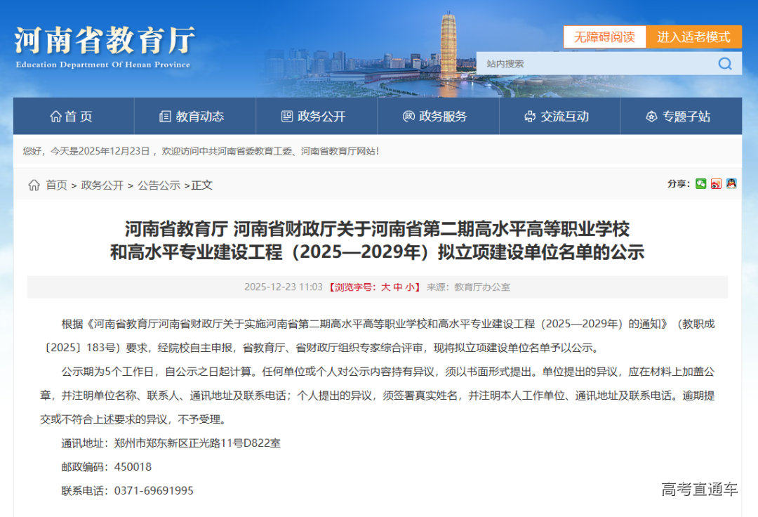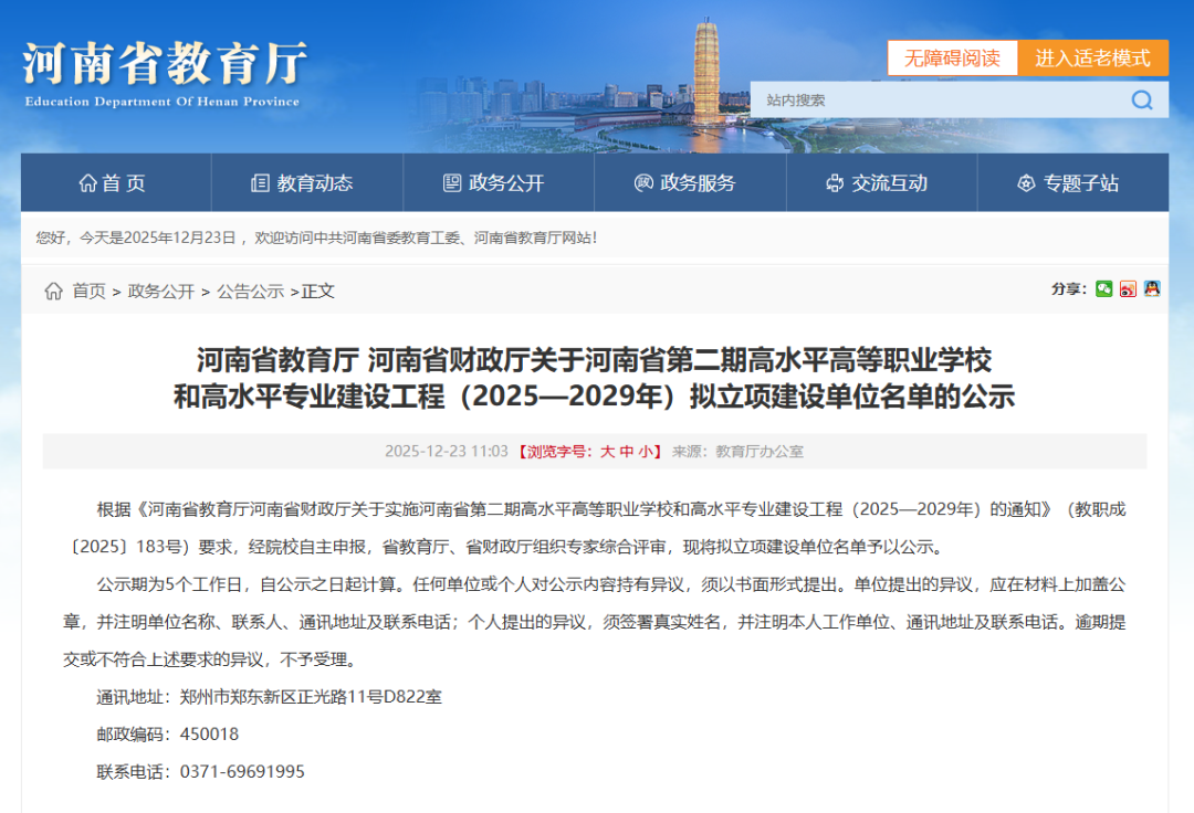 12月23日,河南省教育厅、河南省财政厅发布《关于河南省第二期高水平高等职业学校和高水平专业建设工程(2025—2029年)拟立项建设单位名单的公示》。名单包括:国家“双高计划”重点培育单位拟立项建设单位(10 个)、高水平高等职业学校拟立项建设单位(28 个)、高水平专业群拟立项建设单位(30 个)。