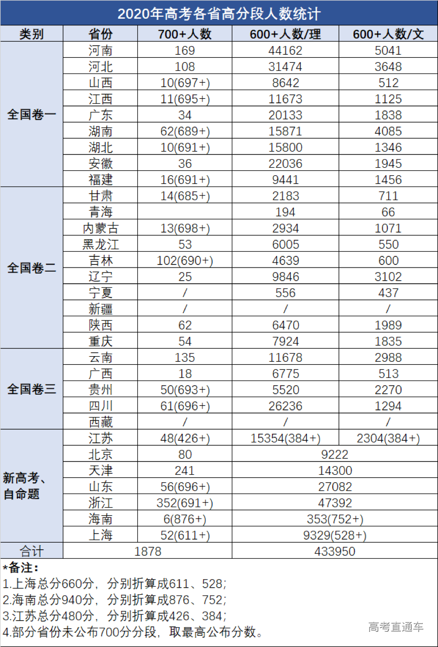 其中,6省份准700分以上人数达787人,在全国占比42%;6省份600分以上达107678人,在全国占比24.8%。