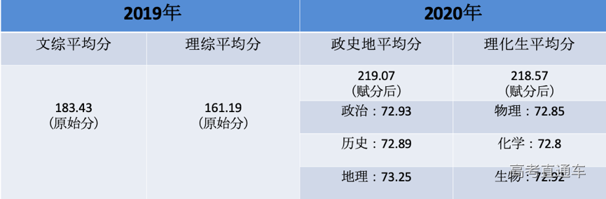 根据天津市教育考试院公布的数据显示,2019年,尚未实行新高考时,天津市文、理综合平均分为183.43分、161.19分;到了2020年,新高考赋分之后,分别变成了219.07分、218.57分。如下图所示。