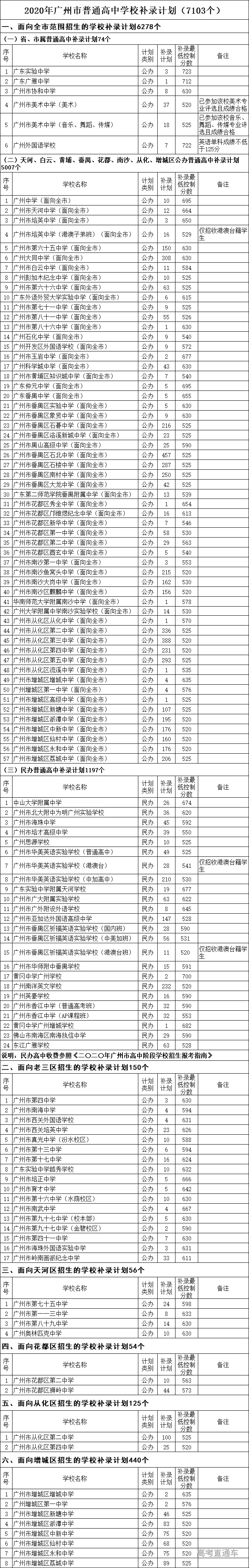补录计划 公办普通高中学校补录计划不再区分户籍生或符合报考公办普通高中条件的随迁子女招生计划。2020年我市普通高中学校补录计划详见附件1。学校信息详见《二〇二〇年广州市高中阶段学校招生报考指南》(简称《报考指南》,下同)。