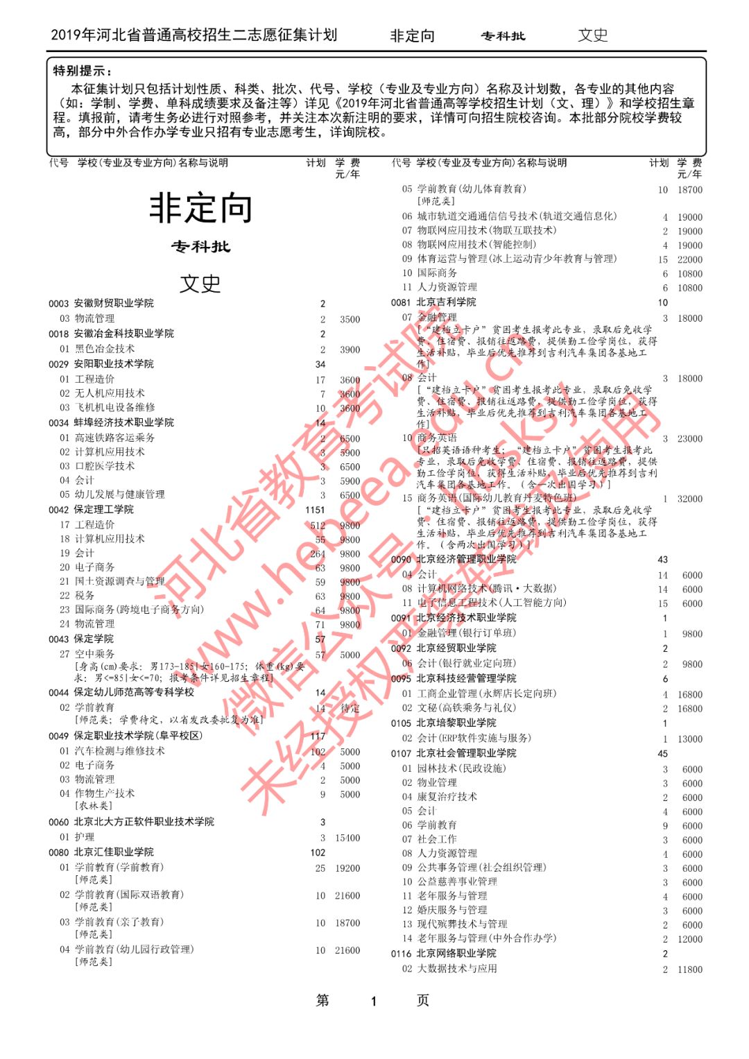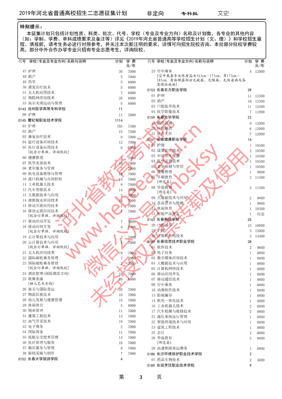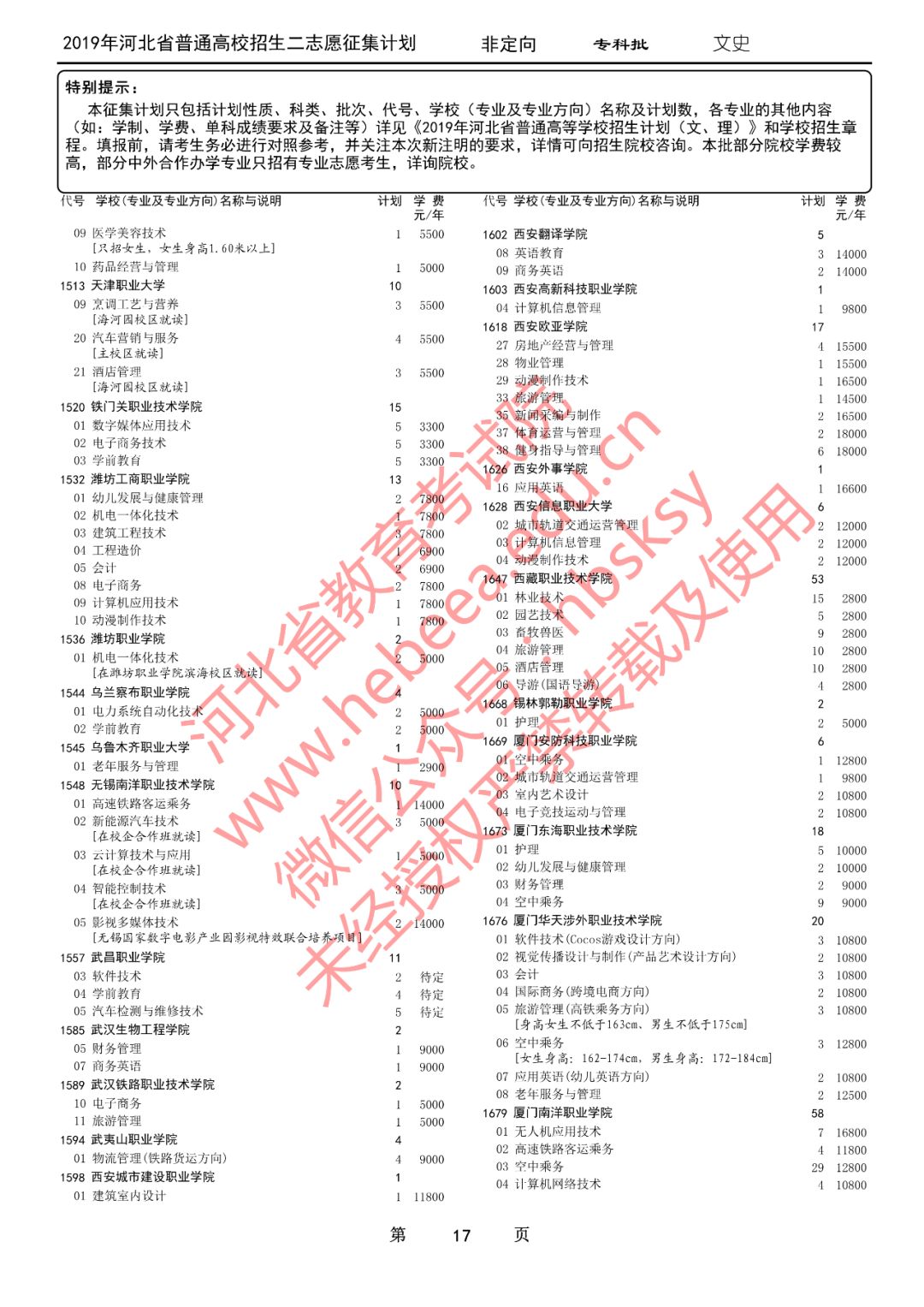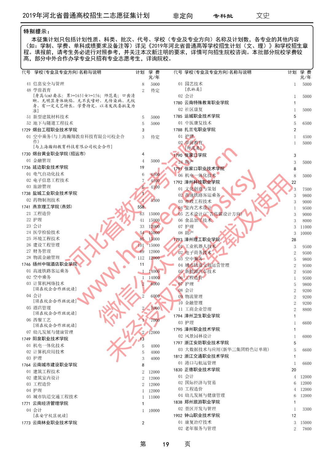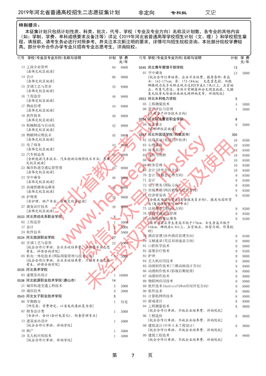 特别提醒:本征集计划只包括计划性质、科类、批次、代号、学校(专业及专业方向)名称及计划数,各专业的其他内容(如:学制、学费、单科成绩要求及备注等)详见《2019年河北省普通高等学校招生计划(文、理)》和学校招生章程。填报前,请考生务必进行对照参考,并关注本次新注明的要求,详情可向招生院校咨询。