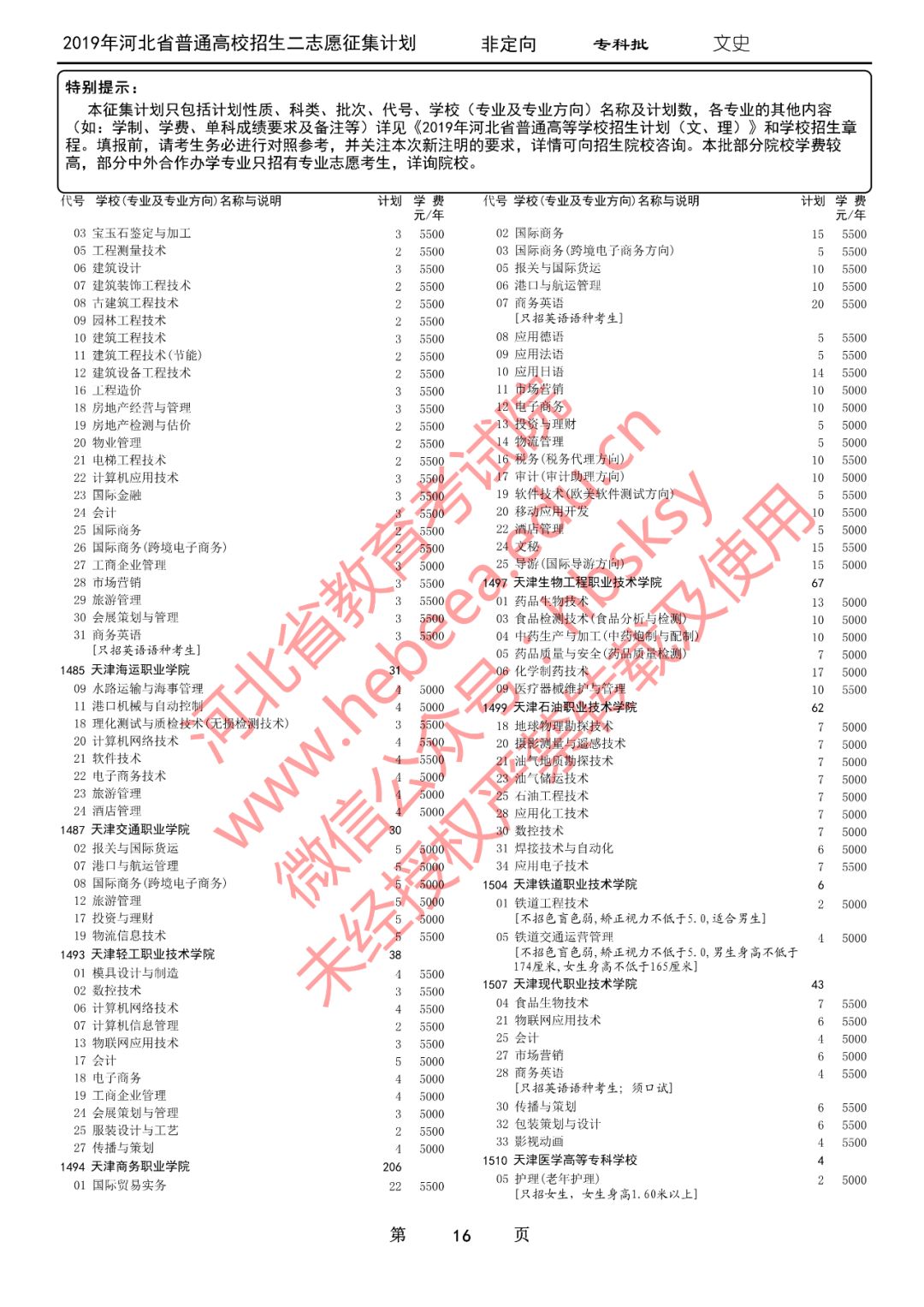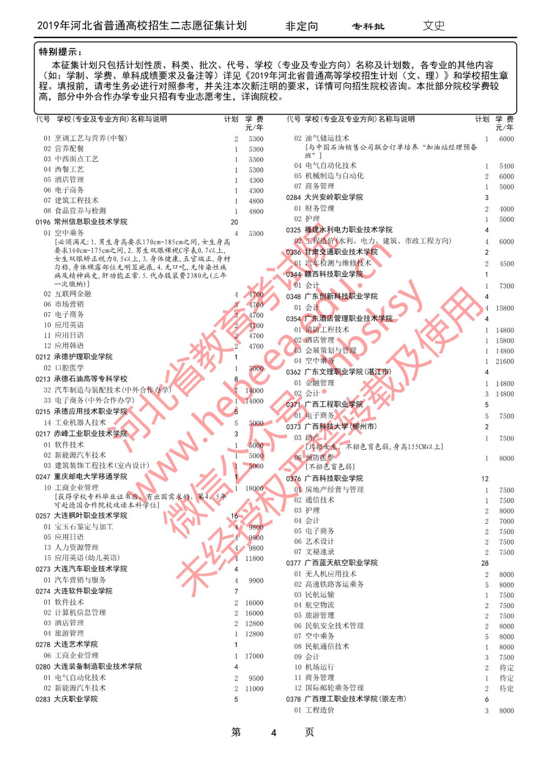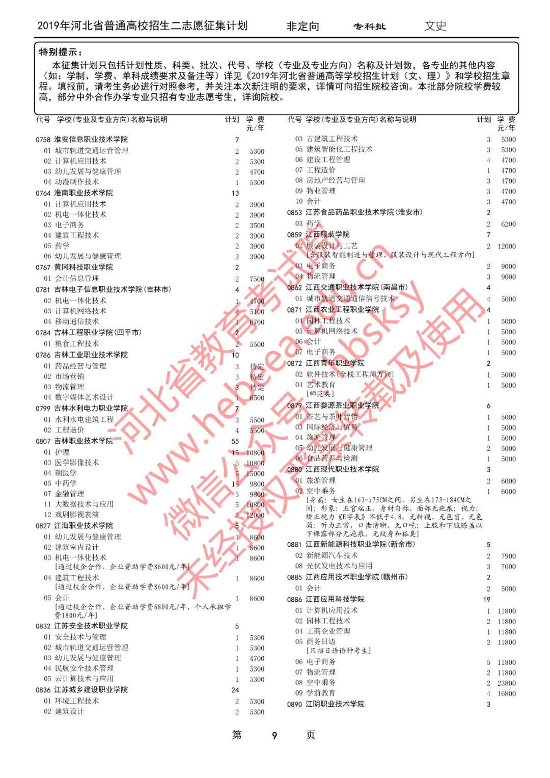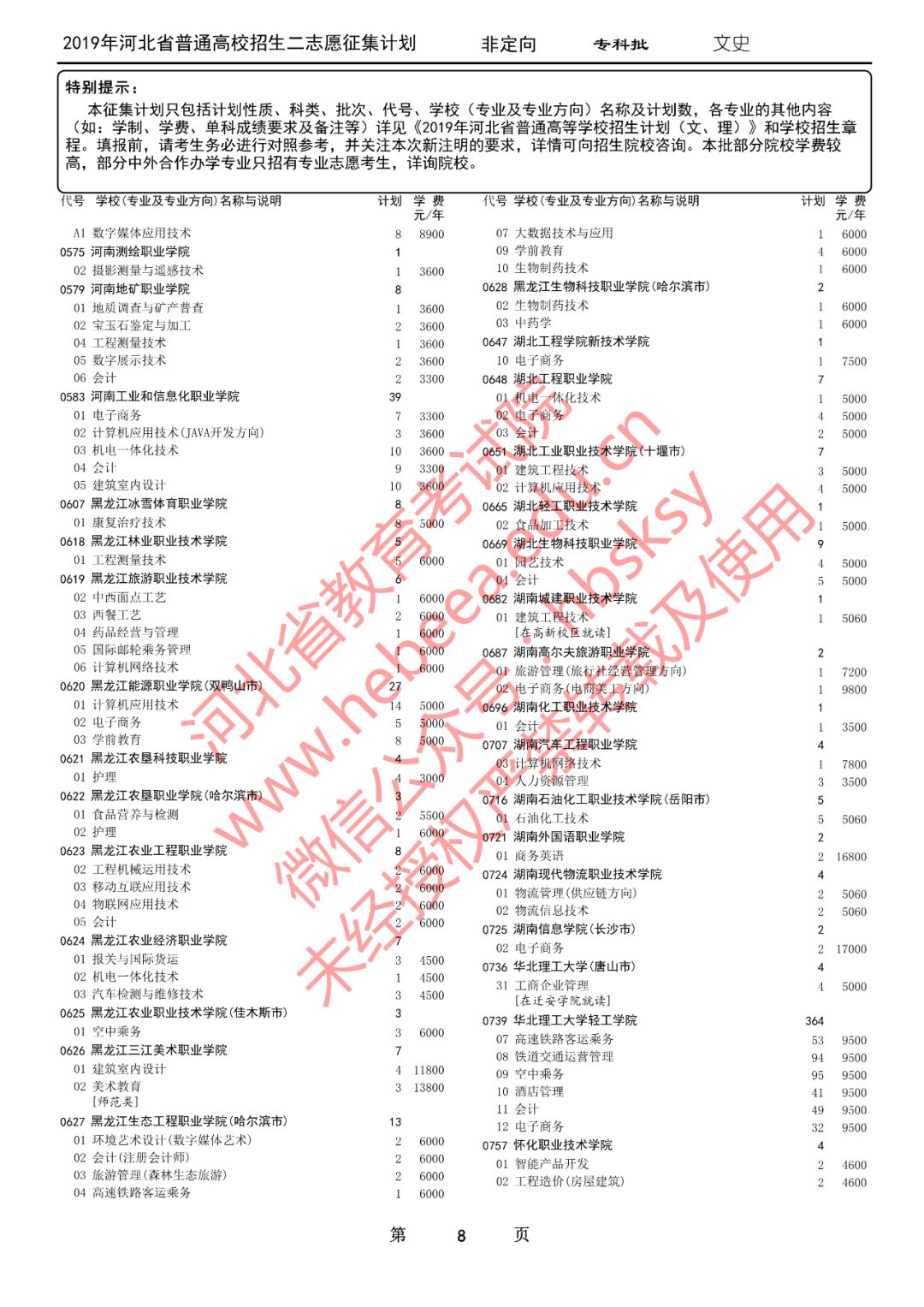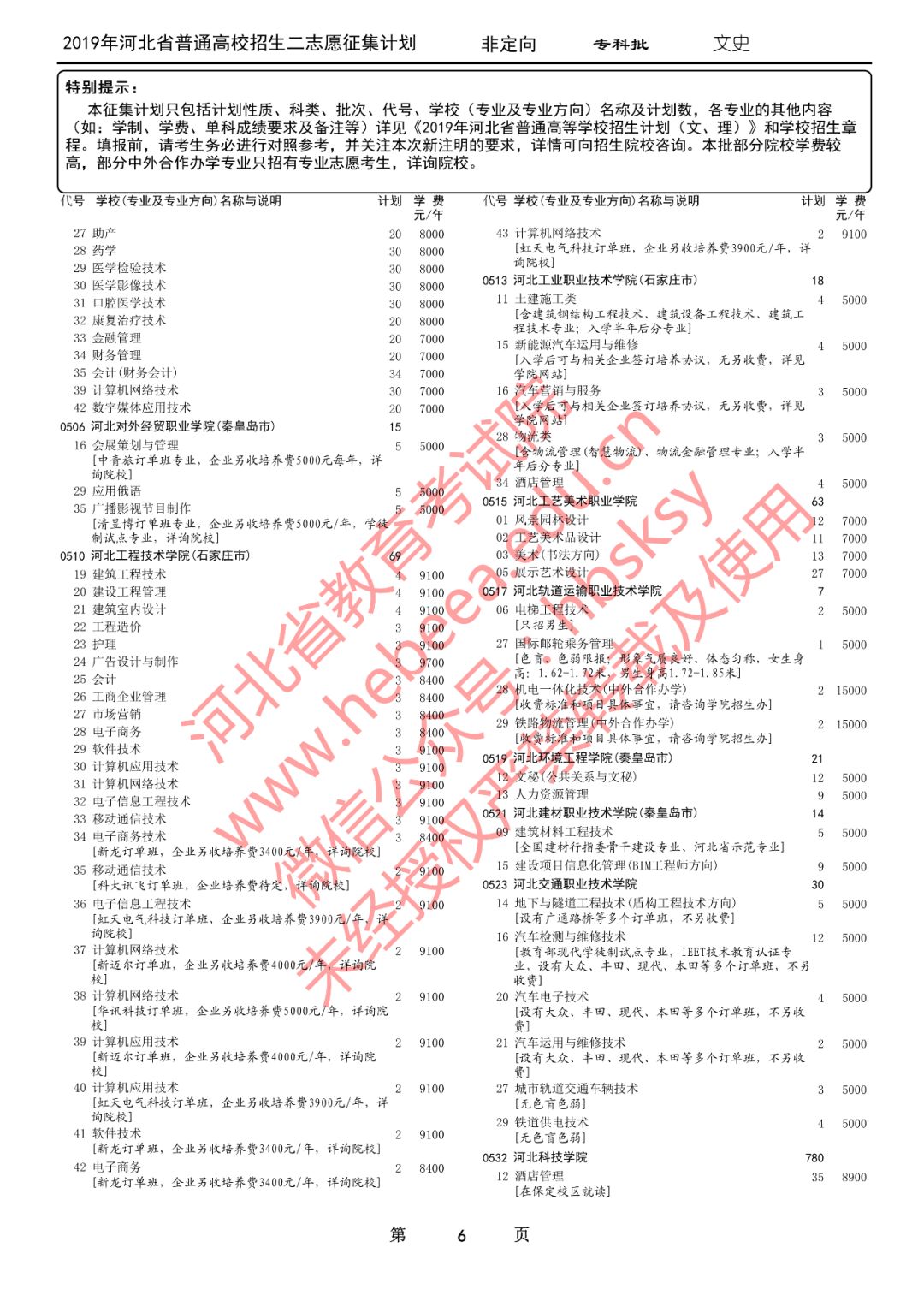 特别提醒:本征集计划只包括计划性质、科类、批次、代号、学校(专业及专业方向)名称及计划数,各专业的其他内容(如:学制、学费、单科成绩要求及备注等)详见《2019年河北省普通高等学校招生计划(文、理)》和学校招生章程。填报前,请考生务必进行对照参考,并关注本次新注明的要求,详情可向招生院校咨询。