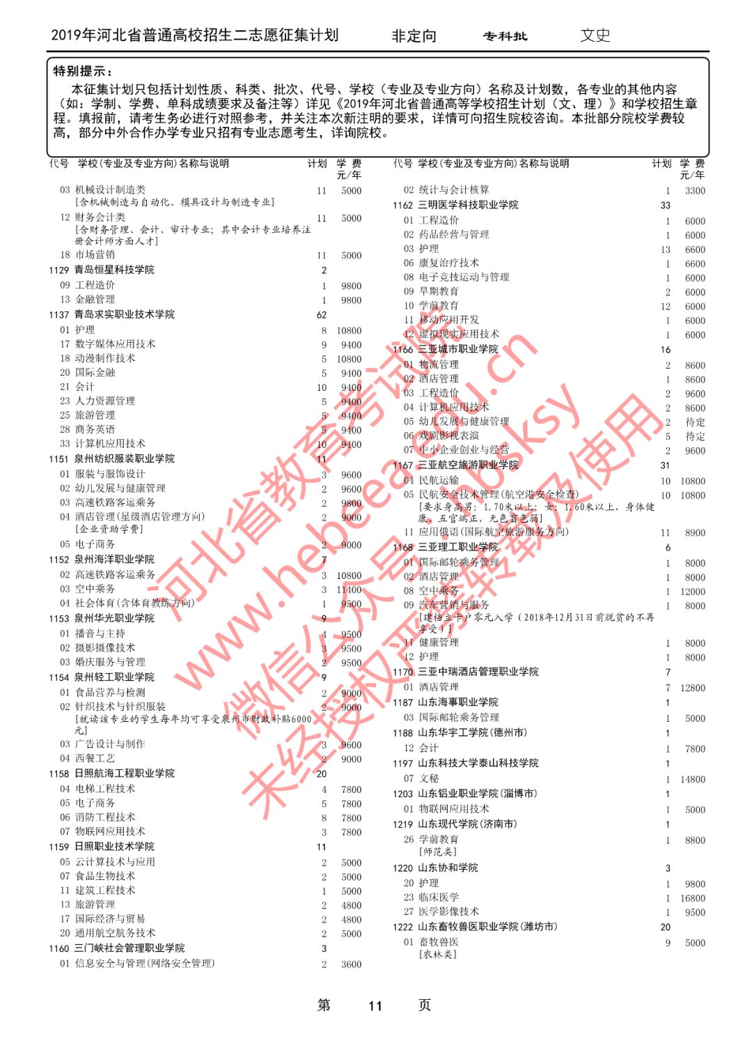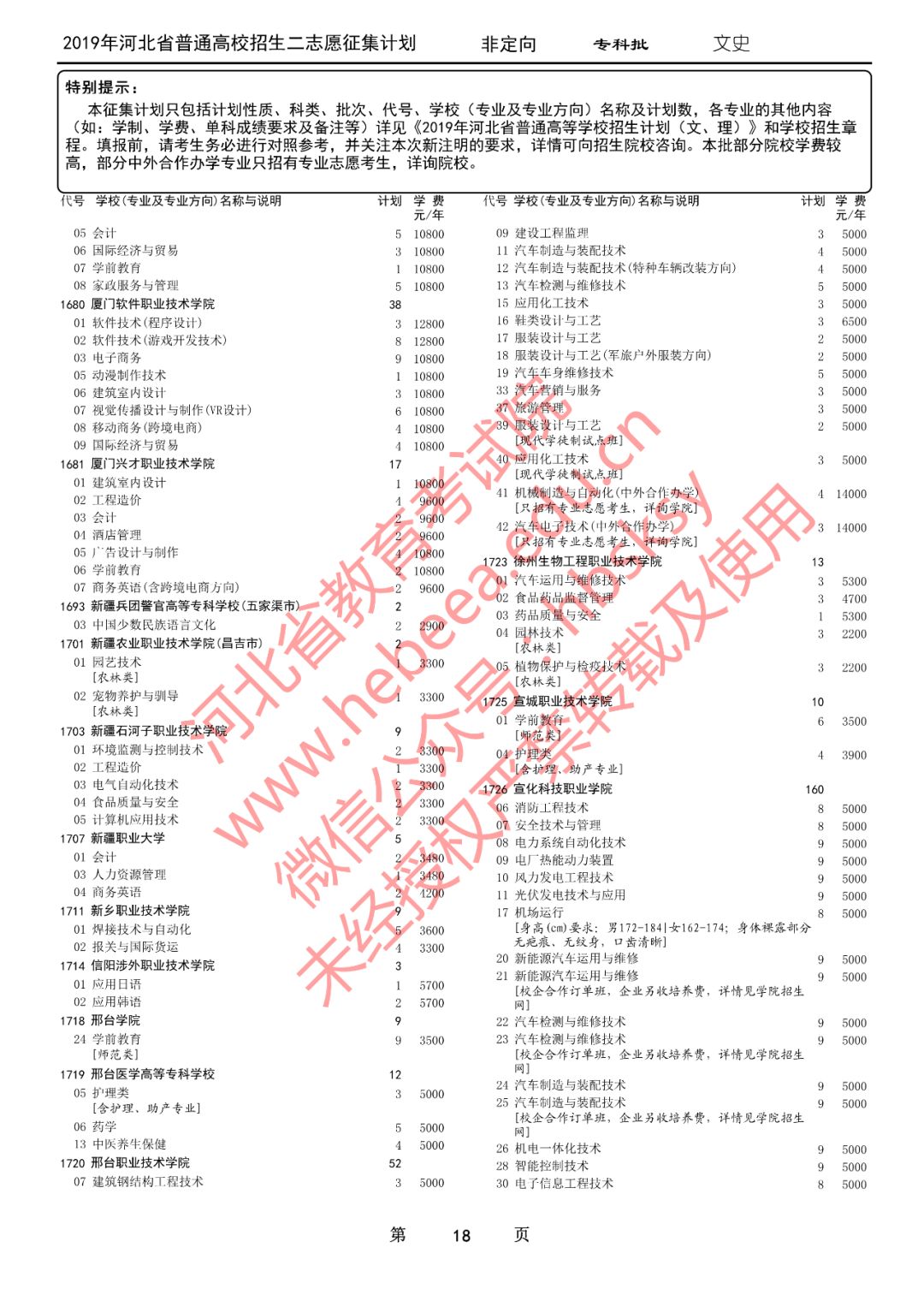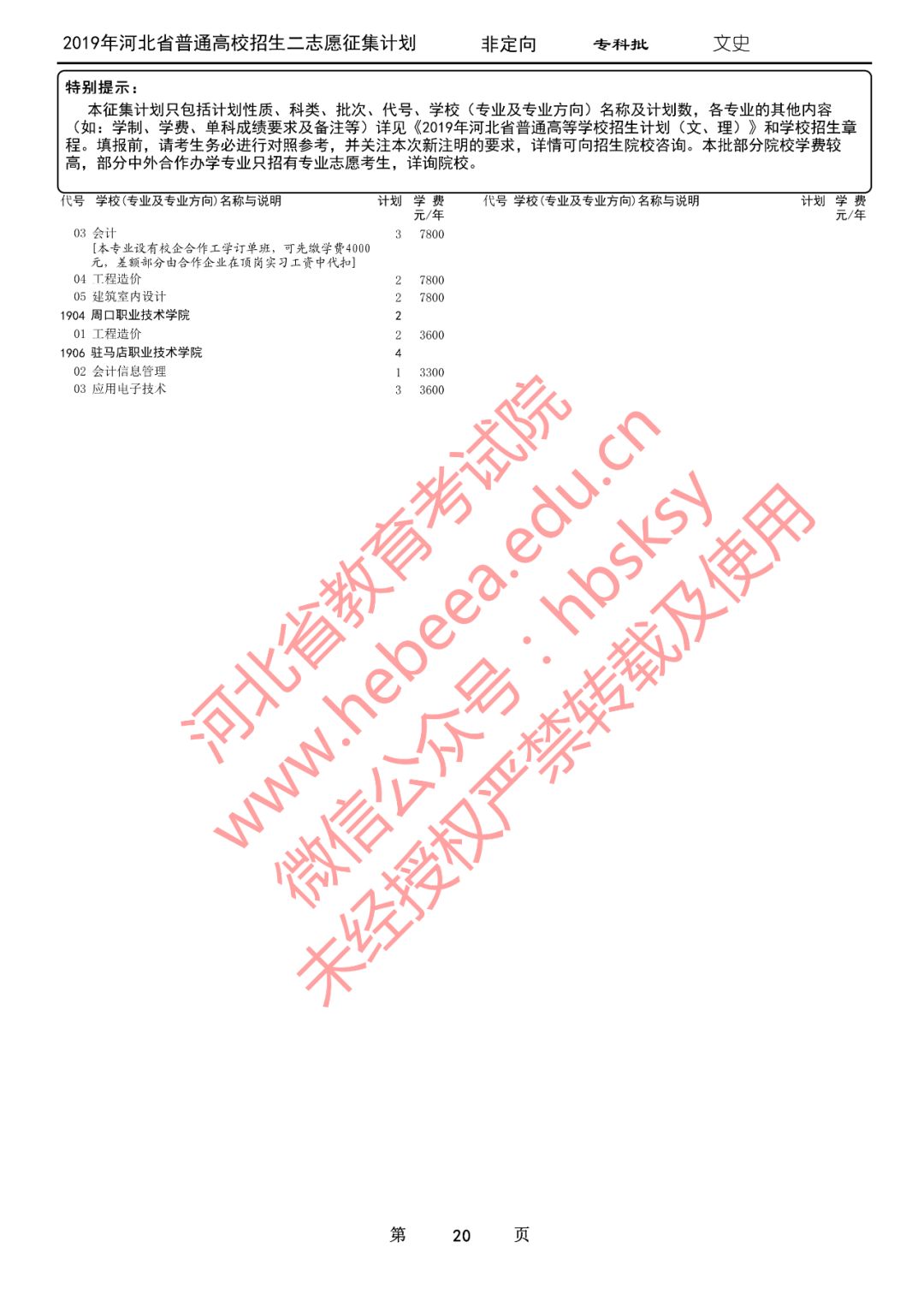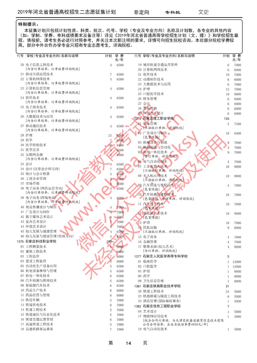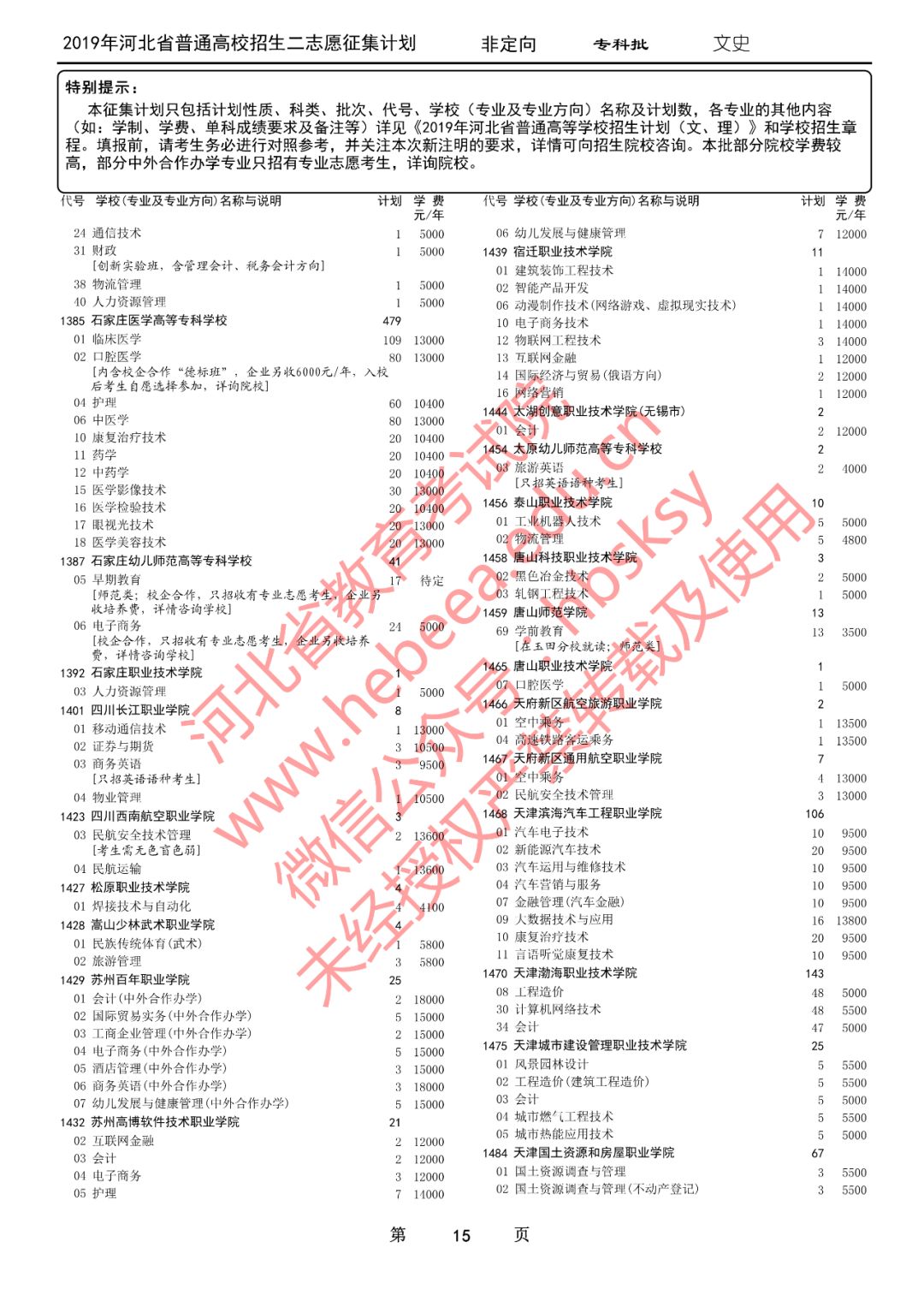 特别提醒:本征集计划只包括计划性质、科类、批次、代号、学校(专业及专业方向)名称及计划数,各专业的其他内容(如:学制、学费、单科成绩要求及备注等)详见《2019年河北省普通高等学校招生计划(文、理)》和学校招生章程。填报前,请考生务必进行对照参考,并关注本次新注明的要求,详情可向招生院校咨询。