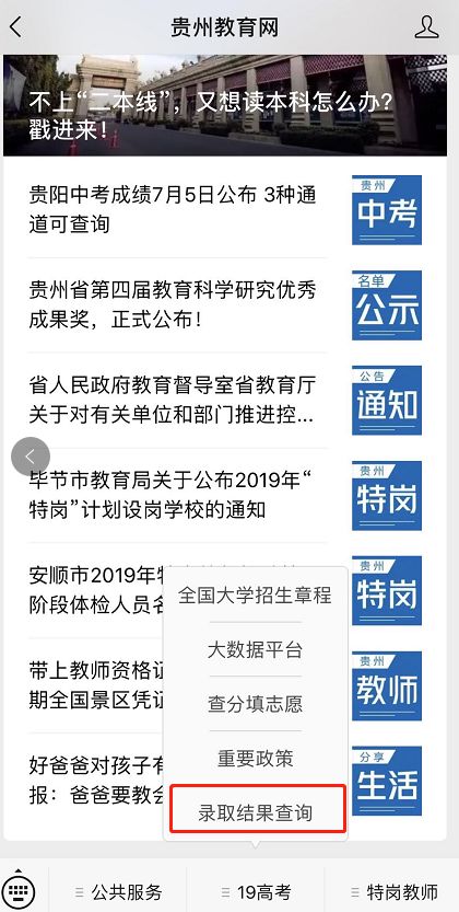 1.贵州省教育厅政务微信。关注贵州省教育厅政务微信“贵州教育发布”(guizhou_edu),进入微信下方菜单栏“2019高考”—“录取查询”正确输入考生个人信息进行查询。