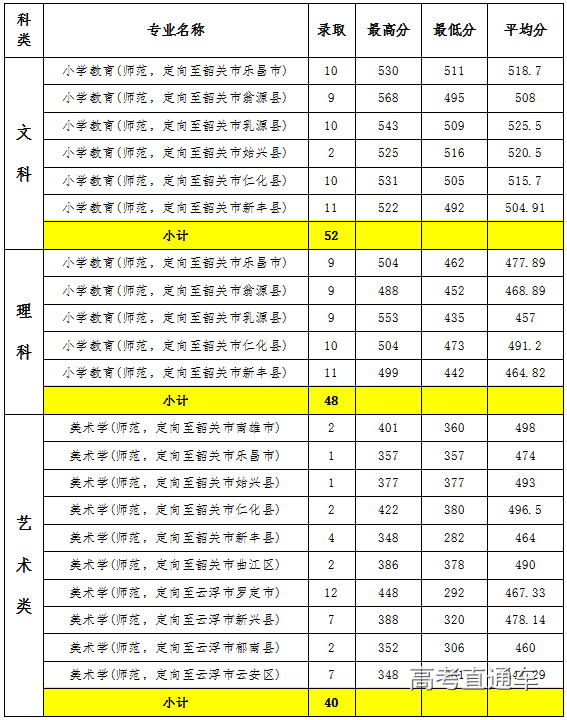 韶关学院2018年公费定向师范生各专业录取情况统计表