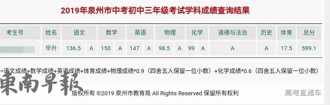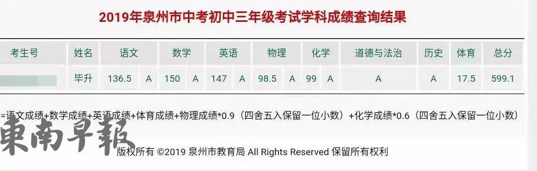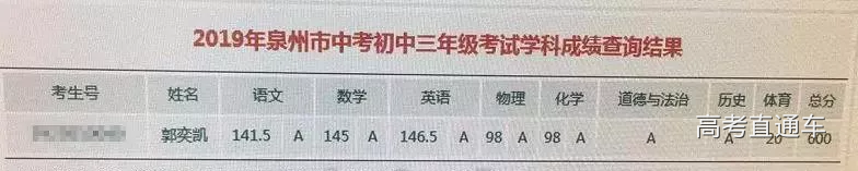 总分第一: 姓名:郭奕凯 学校:永春一中 总分:600 语文:141.5,数学:145,英语:146.5,物理:98,化学:98,体育:20,政治A,历史A 文考总分第一: 姓名:毕升 学校:泉州实验中学 总分:599.1 语文:136.5,数学:150,英语:147,物理:98.5,化学:99,体育:17.5,政治A,历史A,生物A,地理A 1.各位学生、家长可通过登录泉州市教育局官方网站(http://jyj.quanzhou.gov.cn/)查询。 2.泉州通客户端已同步开通查分通道。输入考生10位考生号、考生姓名便能查到中考成绩。