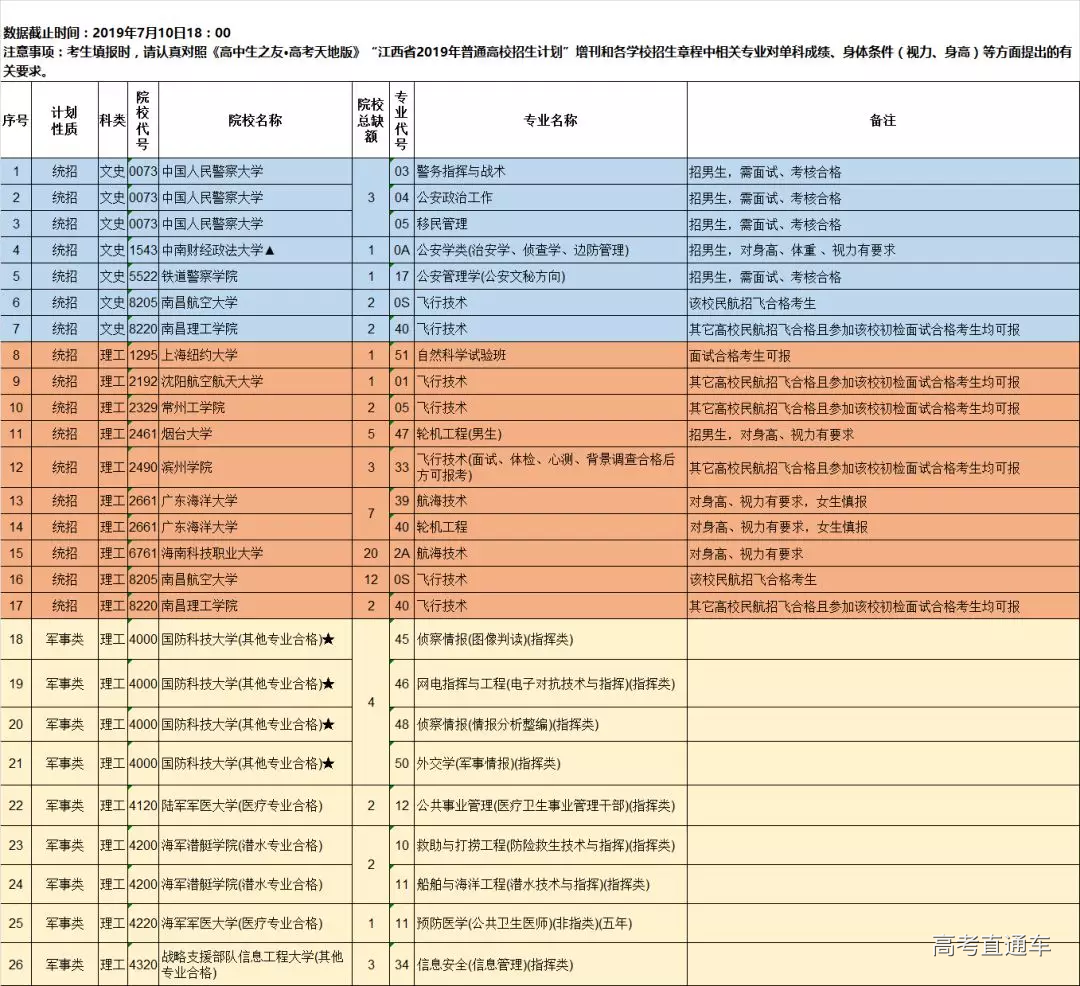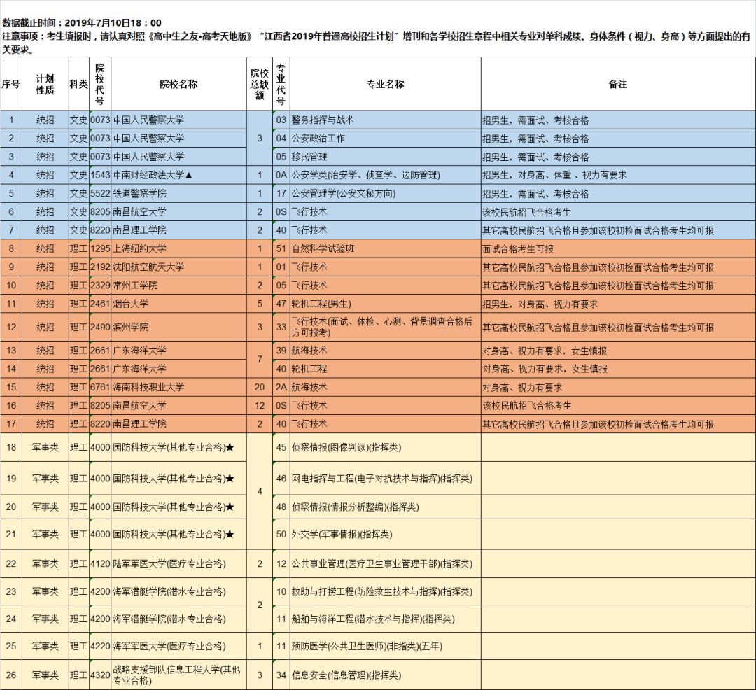 江西省2019年普通高校招生提前批本科院校缺额情况及其缺额专业统计表