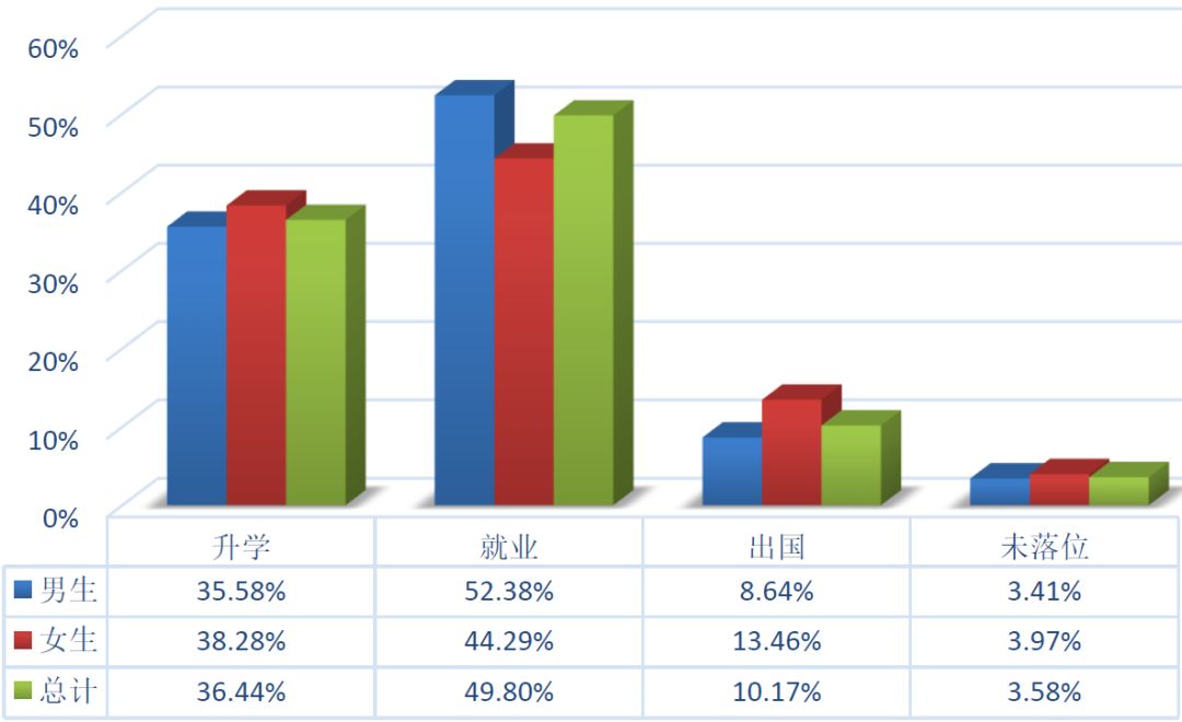 本科毕业生5859人中,男生3994人、女生1865人。毕业去向分别为升学2135人、就业2918人、出国(出境)596人,就业结构如图所示。