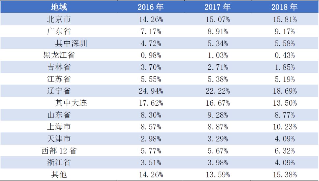 近三年,我校入职毕业生中,留在辽宁的比例最高,进入北京、上海、广东、西部等地的比例相对较高。