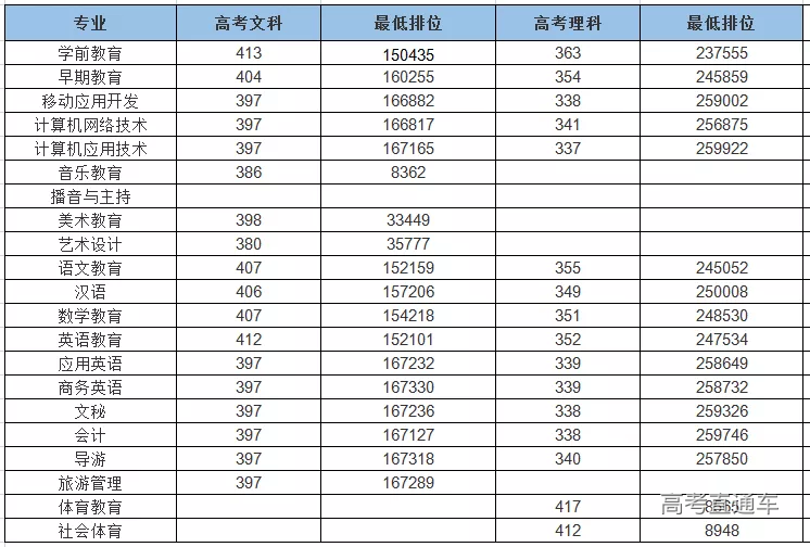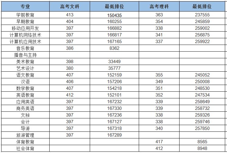 2019年各专业录取最低分及排位情况 (广东省) 注: 1.以上为我校2019年录取最低分及排位情况,仅供考生参考。 2.小学教育(师范)、心理健康教育(师范)、财务管理、酒店管理、美术(书法)为新增专业,暂无往年的录取分数参考。 2019年各专业录取最低分及排位情况 (省外) 注: 1.根据我校往年在省外招生的经验,考生如果达到各自所在省份的最低分数线要求,建议第一志愿填报我校,录取机会都很大。 2.会计、计算机应用技术、旅游管理是我校2020年在外省新增招生专业,青海和陕西是我校2020年新增的招生省份,暂无往年的录取数据。