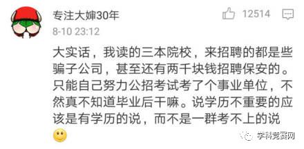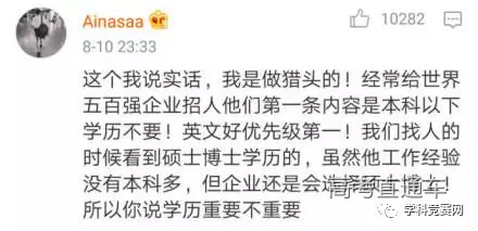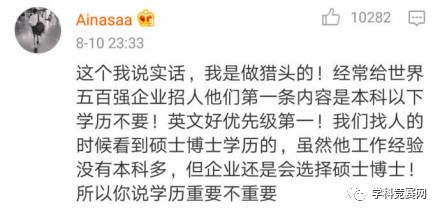 打个比方说,一个专科生做到管理层,试图告诉你学历不重要,可他自己还是以招到清华助理为荣,拿来吹嘘,他要是不重视学历,他自己怎么不去招专科生?
