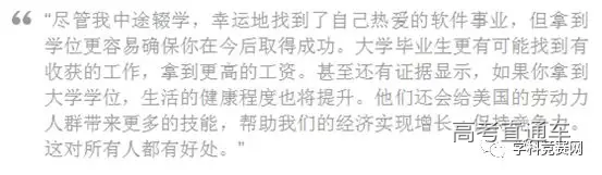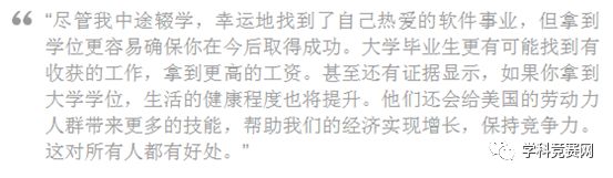 而扎克伯格从哈佛辍学13年后,拿到了哈佛的荣誉法学博士学位。辍学不代表他们不重视学历,恰恰相反,他们都强调学历的重要性。